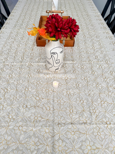 Table Cover: 135 x 58 inches Approx’. Aghabani Oriental for Rectangle Tables, Beige background with Gold & White Silk Embroidery