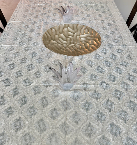 Table Cover: 94 x 59 inches Approx'. Aghabani Oriental for Rectangle Tables, Beige background with White, Silver and Gray colored Silk Embroidery