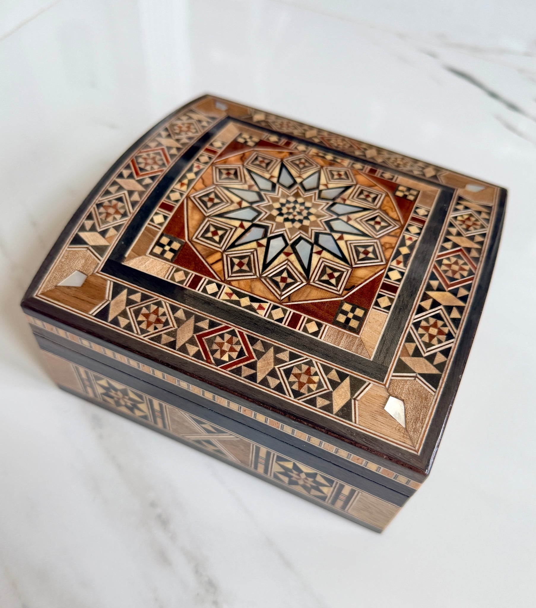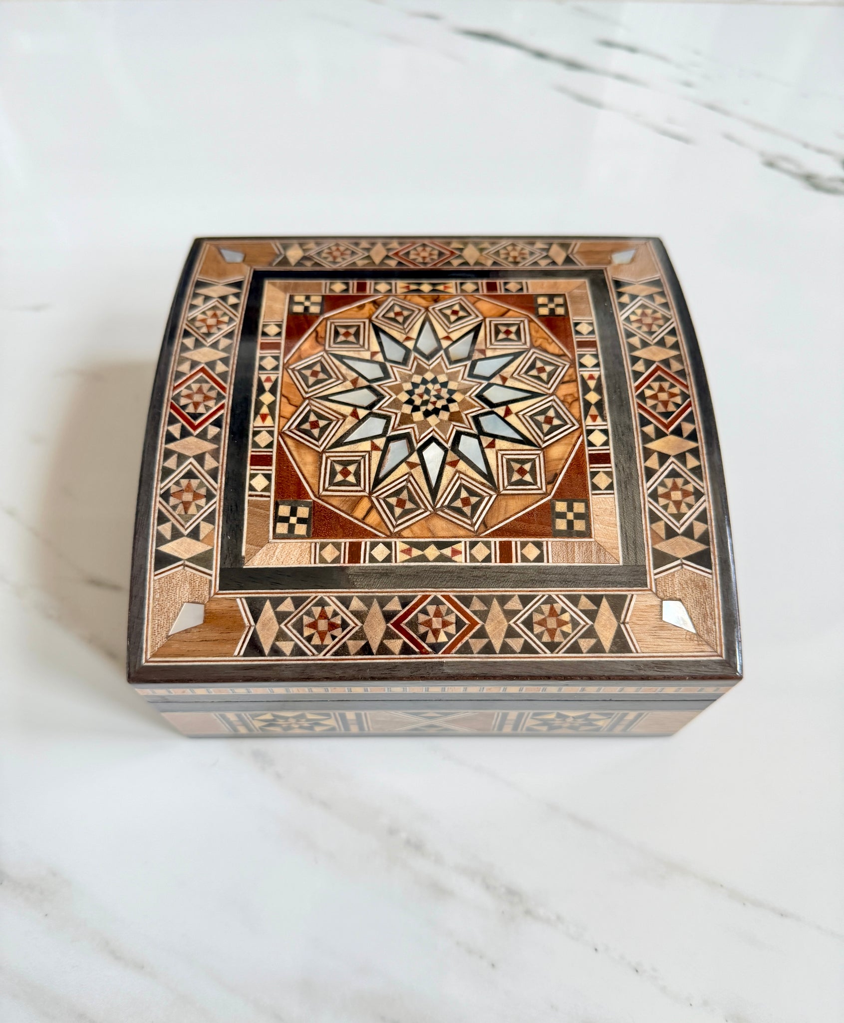 Handmade product composed mostly of solid walnut, then inlaid with a variety of different fruit woods. It is made by combining small pieces of wood together.