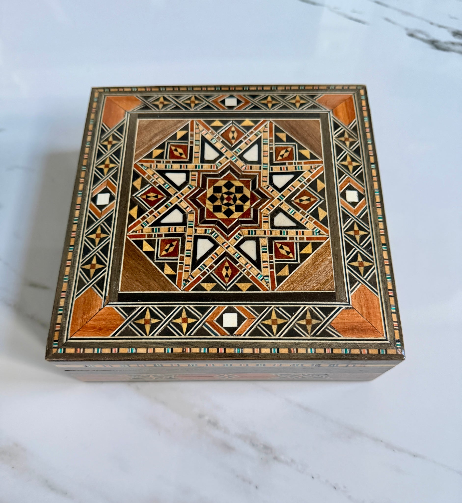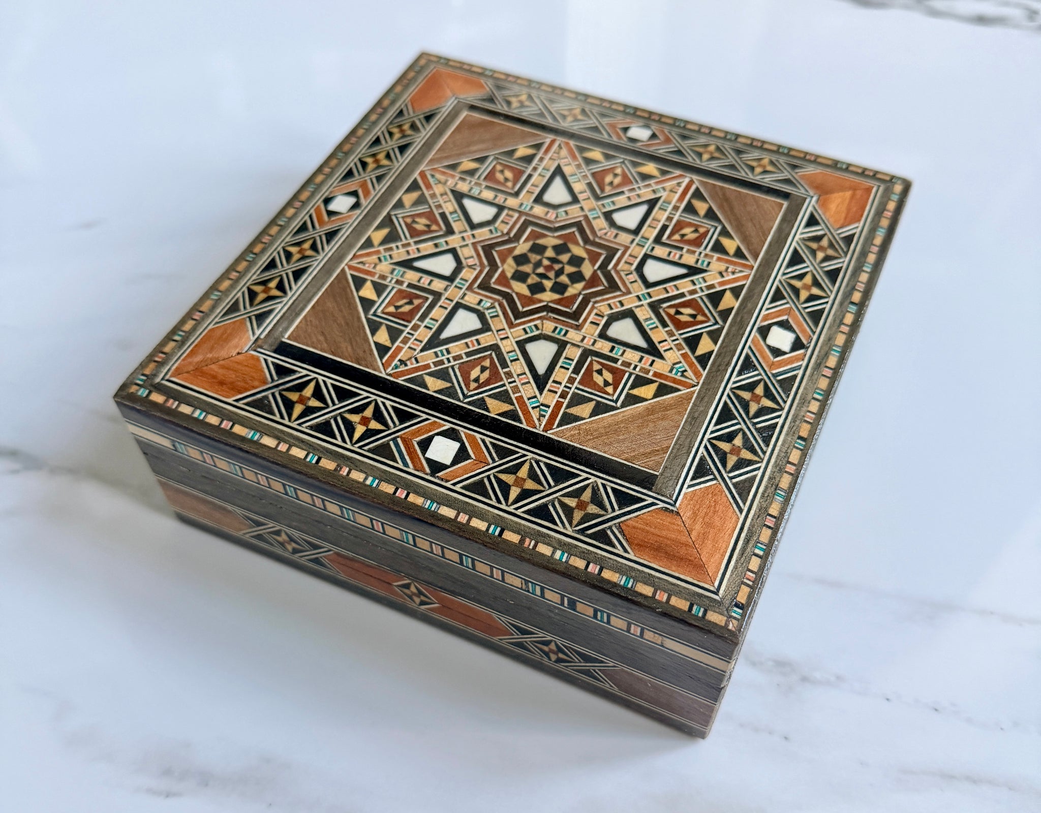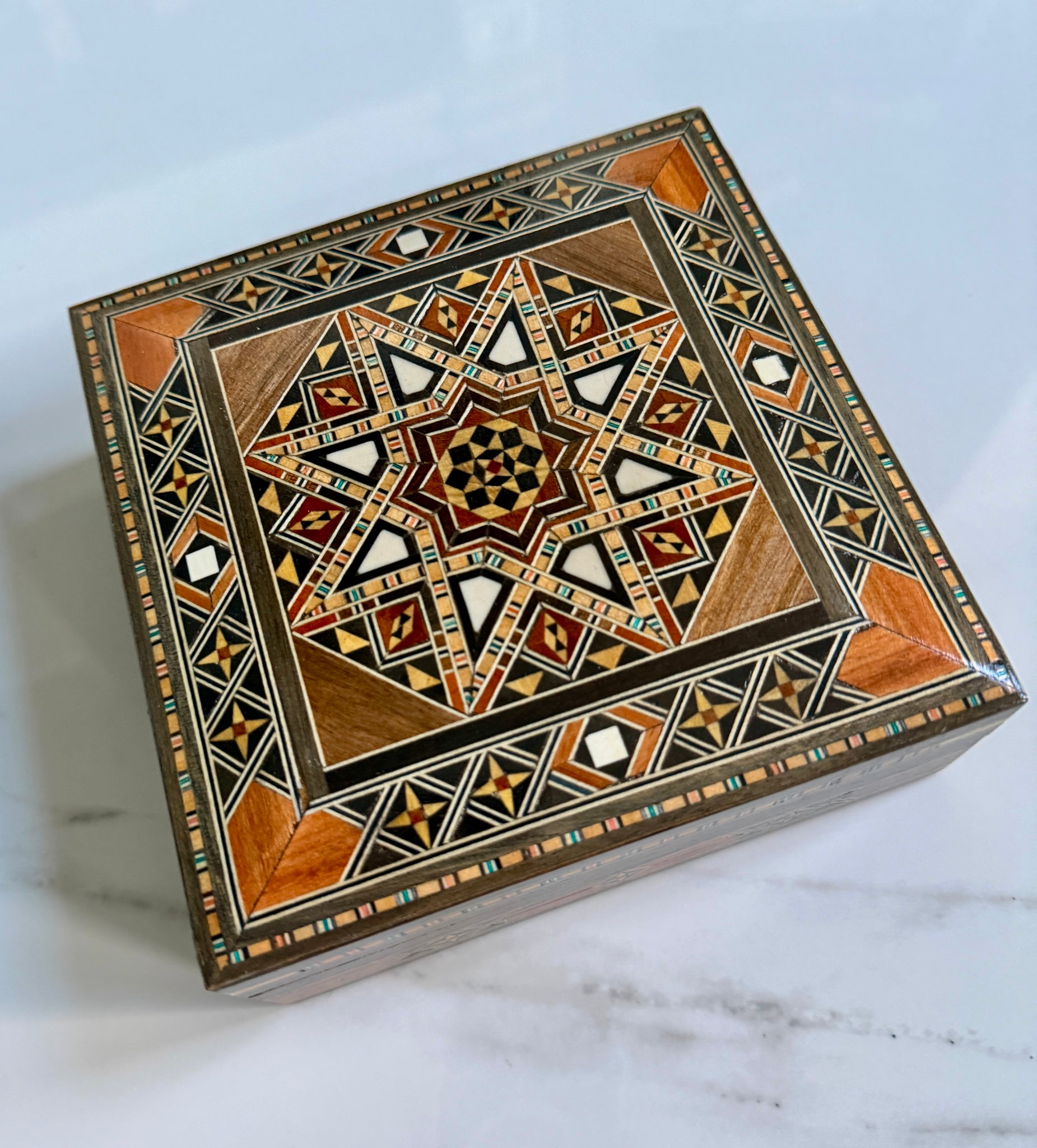 Handmade product composed mostly of solid walnut, then inlaid with a variety of different fruit woods. It is made by combining small pieces of wood together.