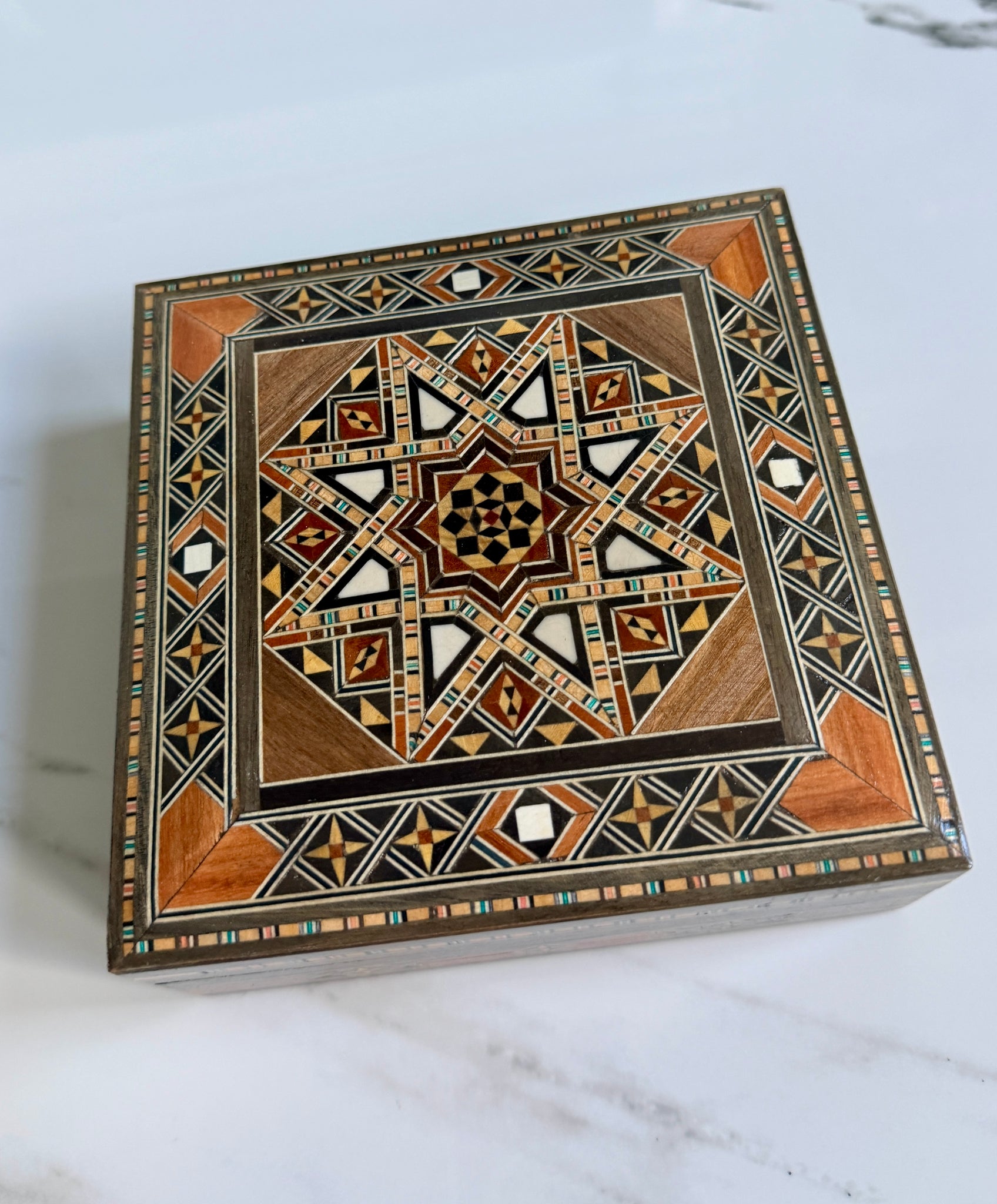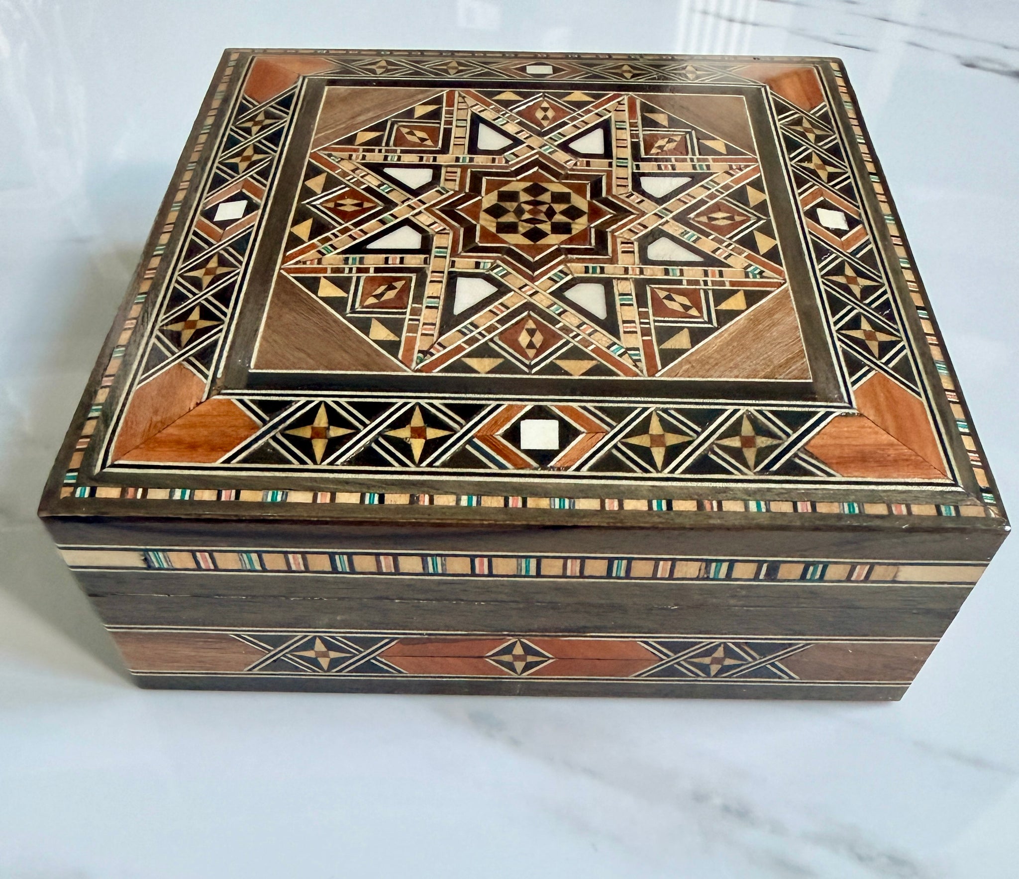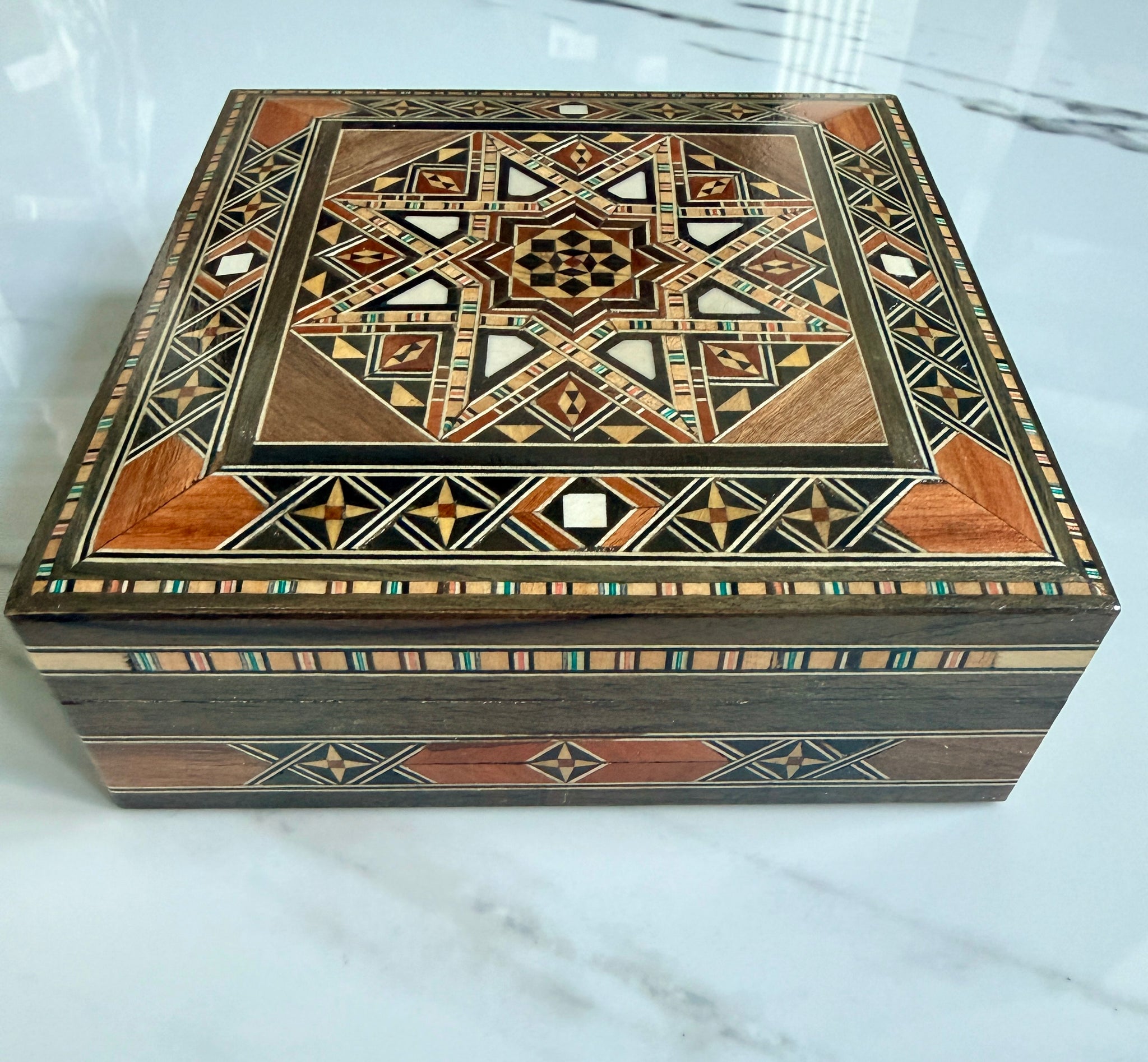 Handmade product composed mostly of solid walnut, then inlaid with a variety of different fruit woods. It is made by combining small pieces of wood together.