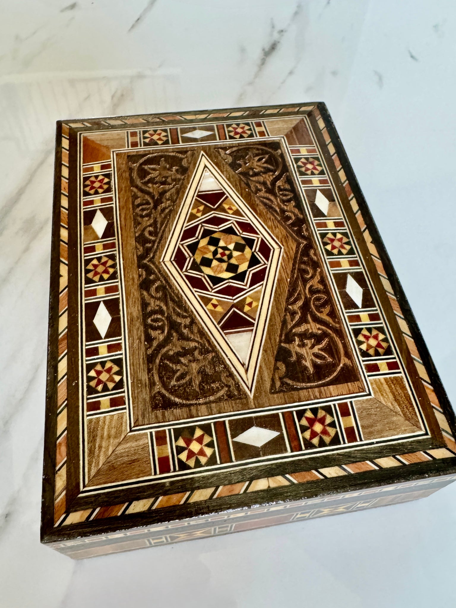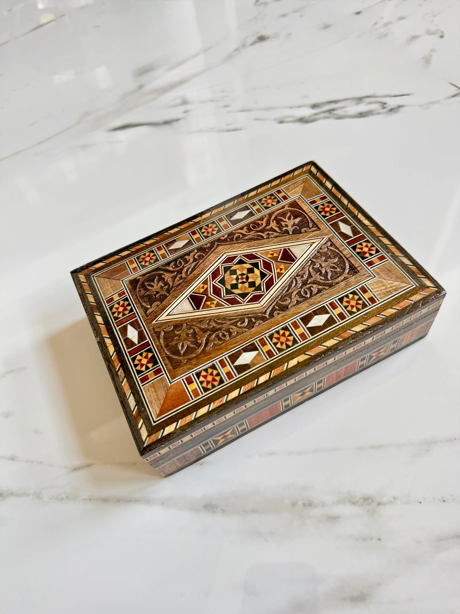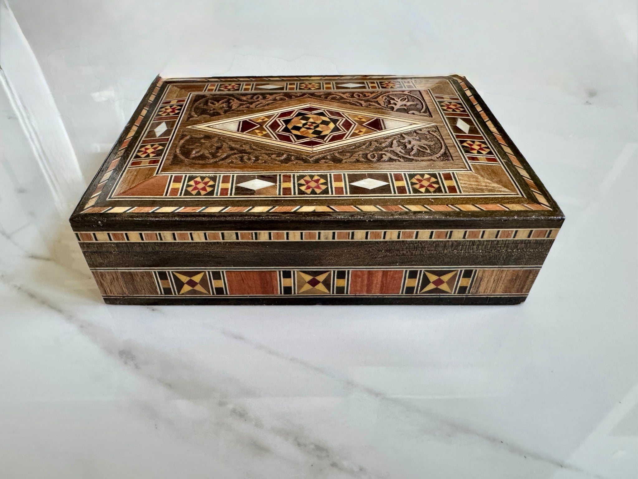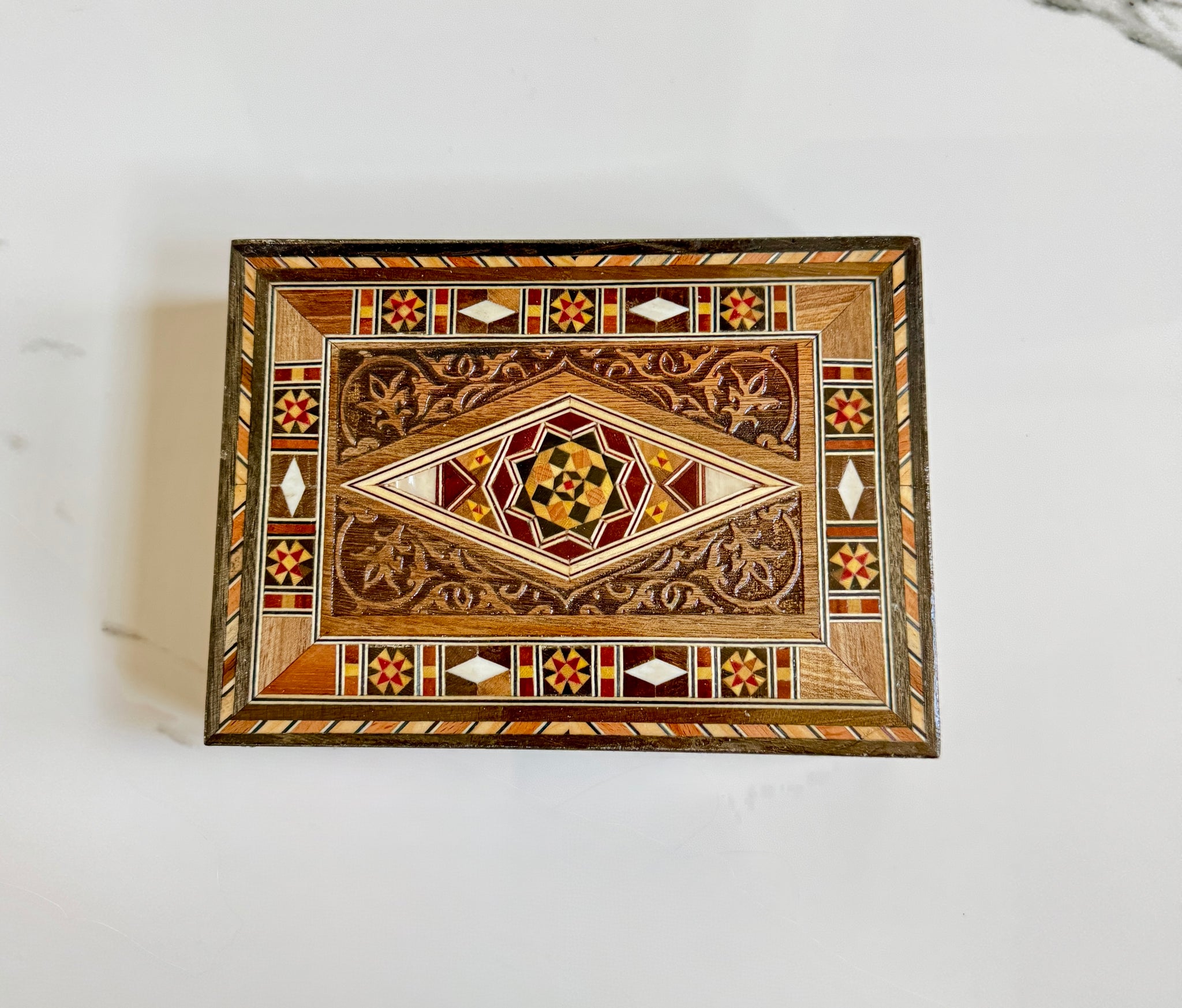 Handmade product composed mostly of solid walnut, then inlaid with a variety of different fruit woods. It is made by combining small pieces of wood together.