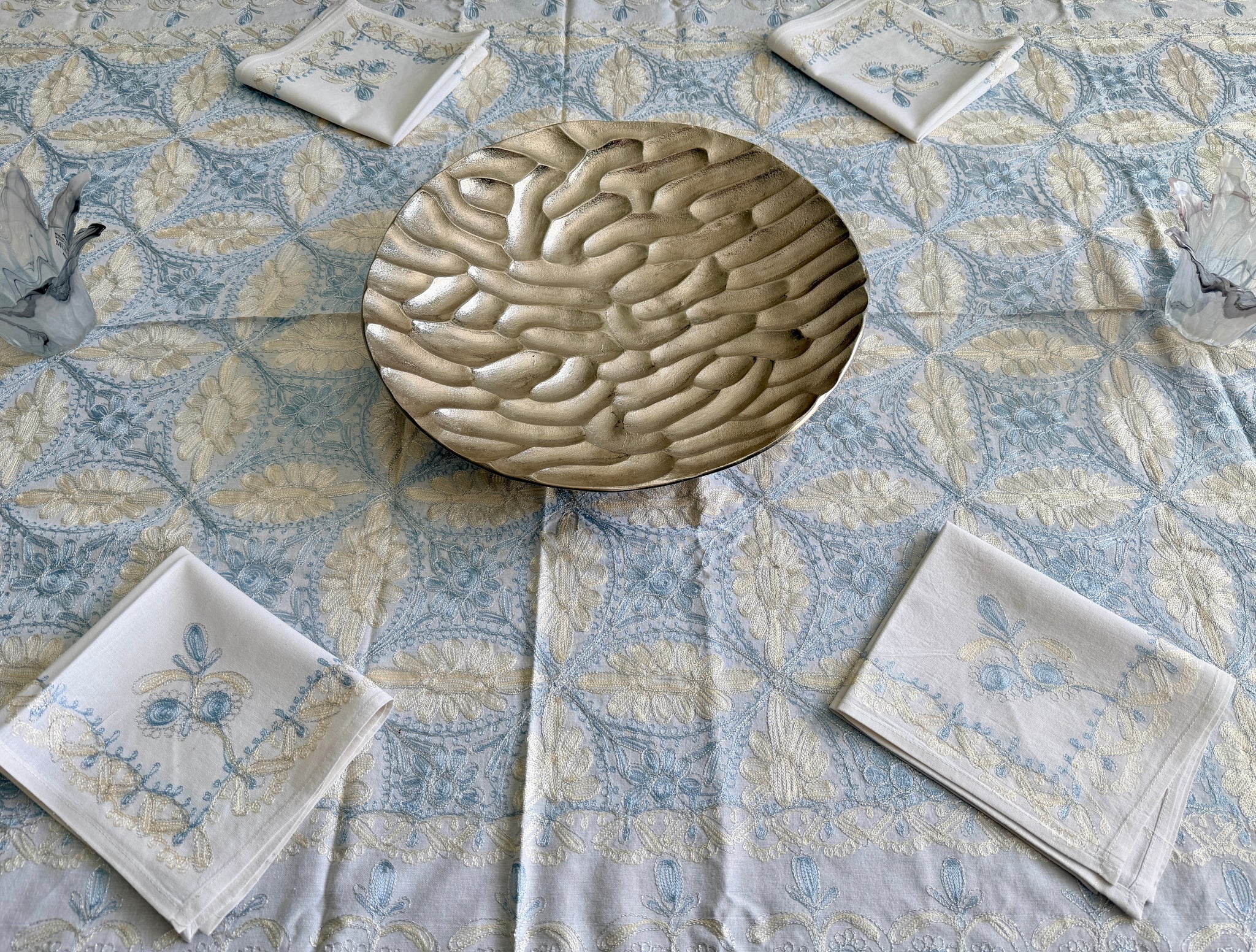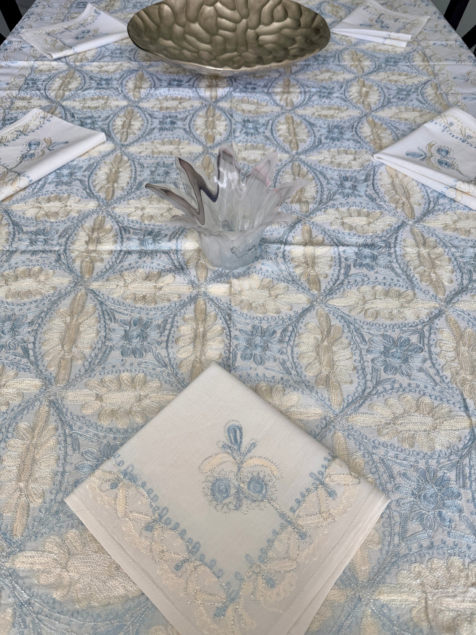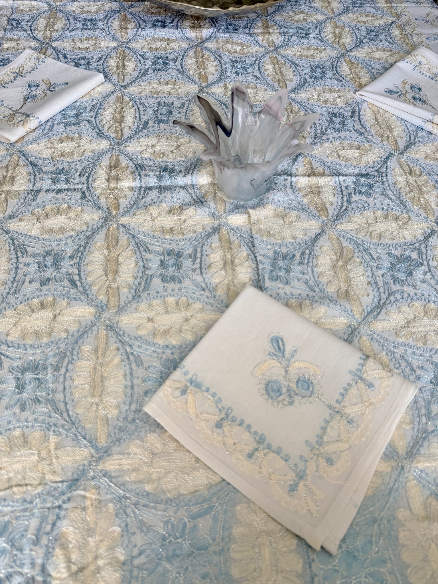The tablecloth is made of high-quality cotton, hand-embroidered with gold and blue silk