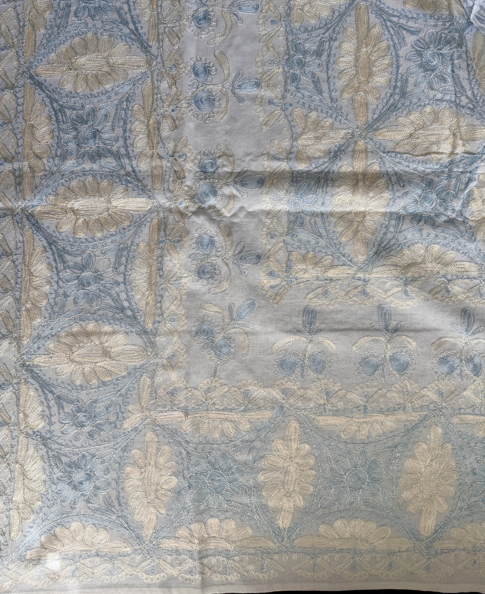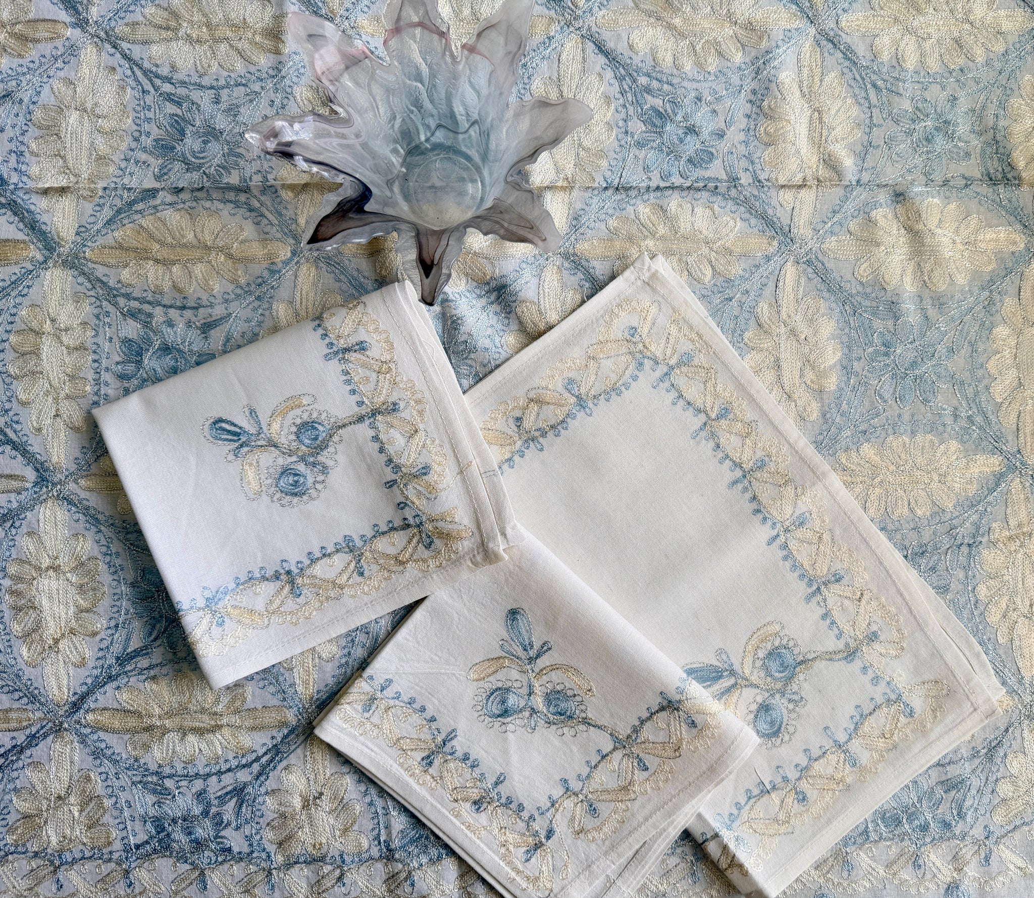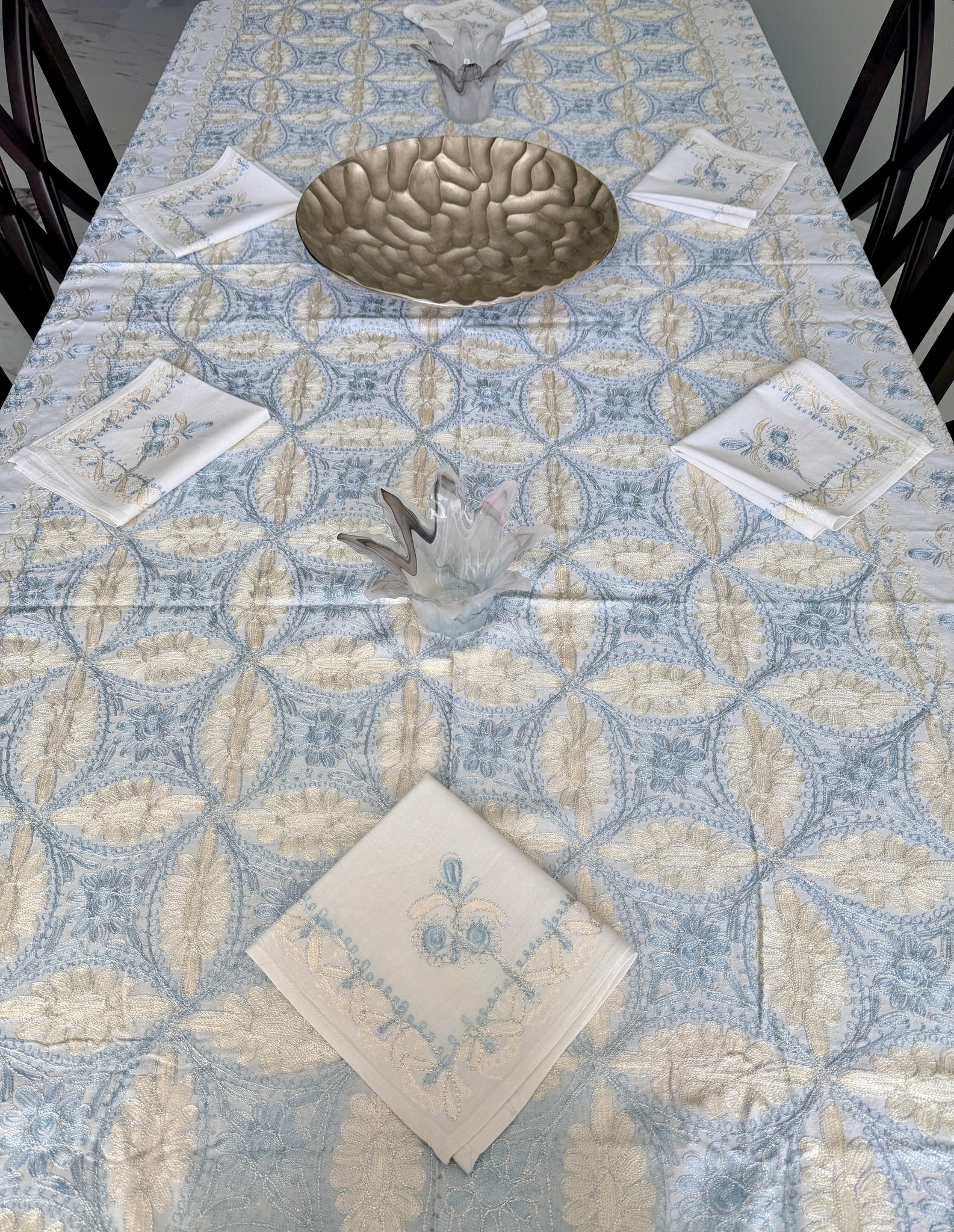 The tablecloth is made of high-quality cotton, hand-embroidered with gold and blue silk