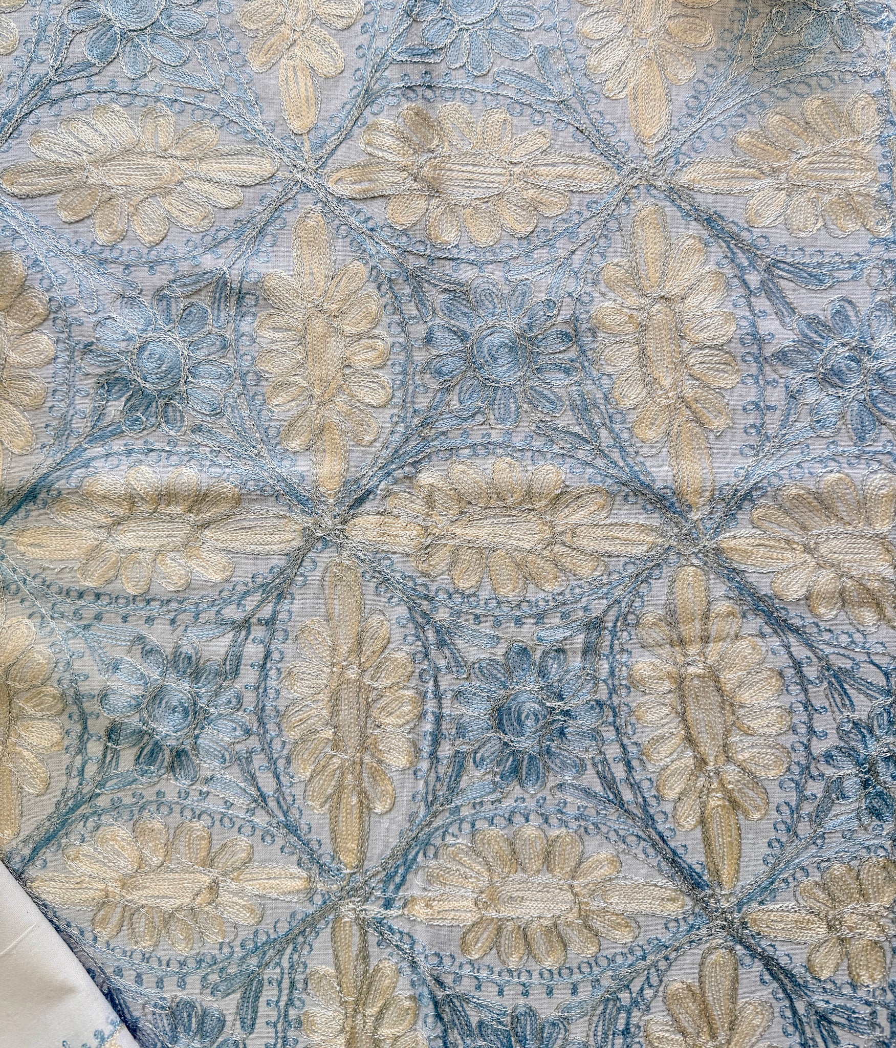 White Background with Gold and Blue Silk Embroidery.