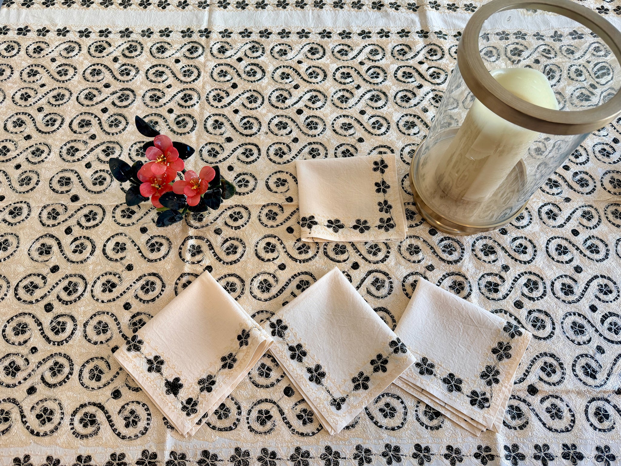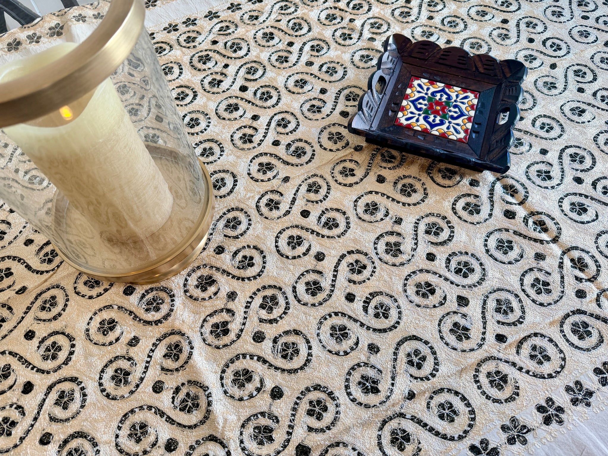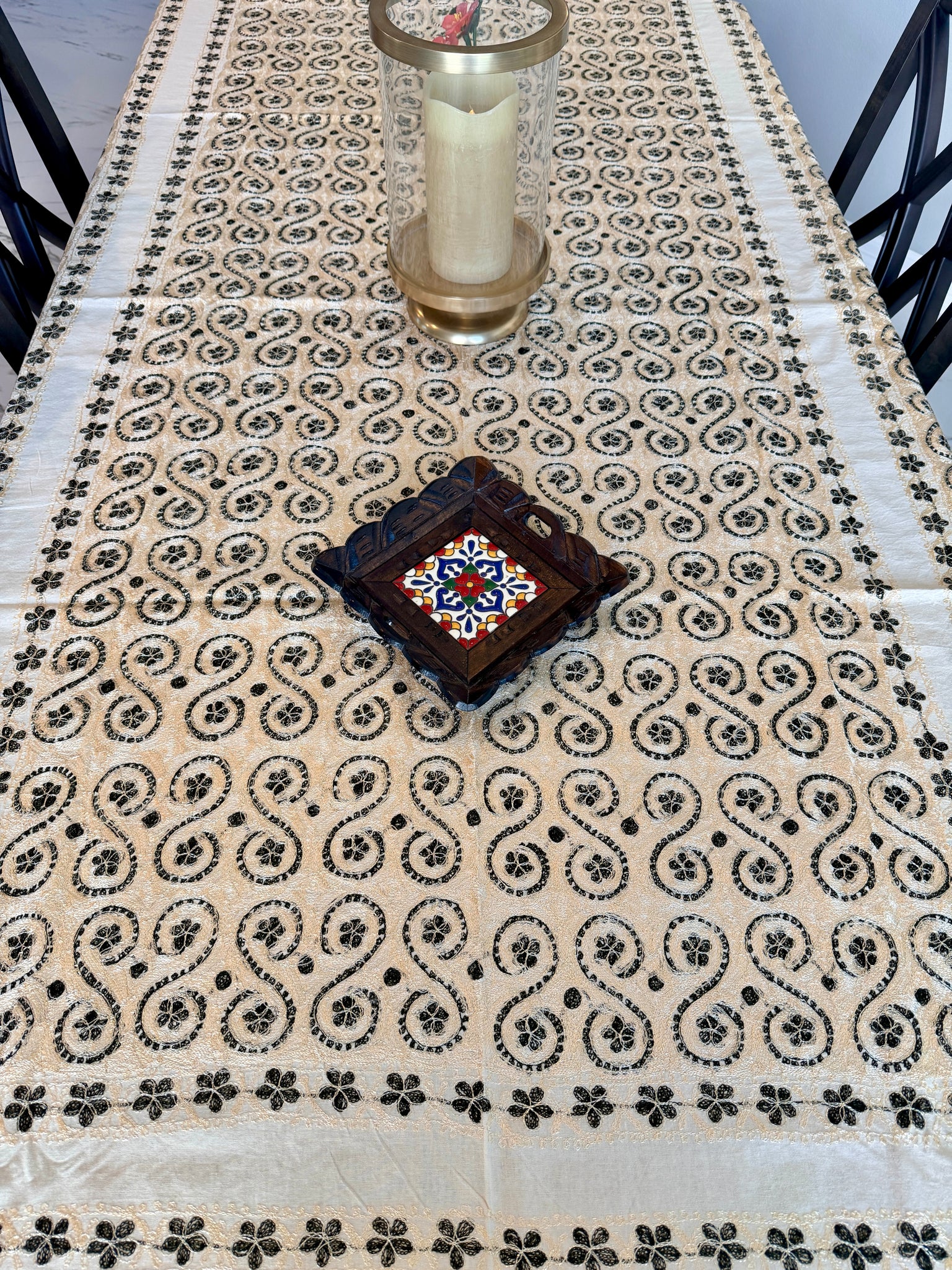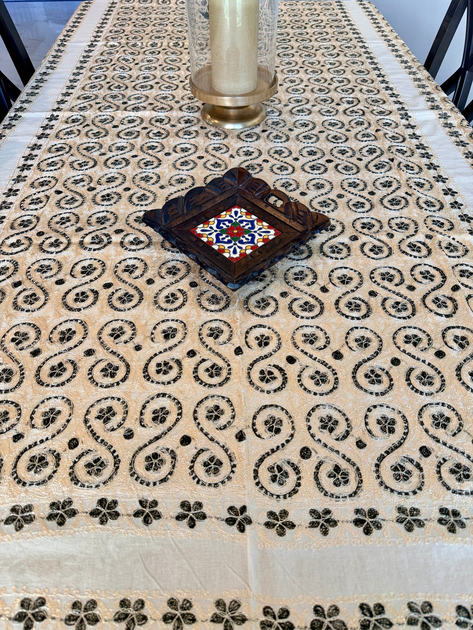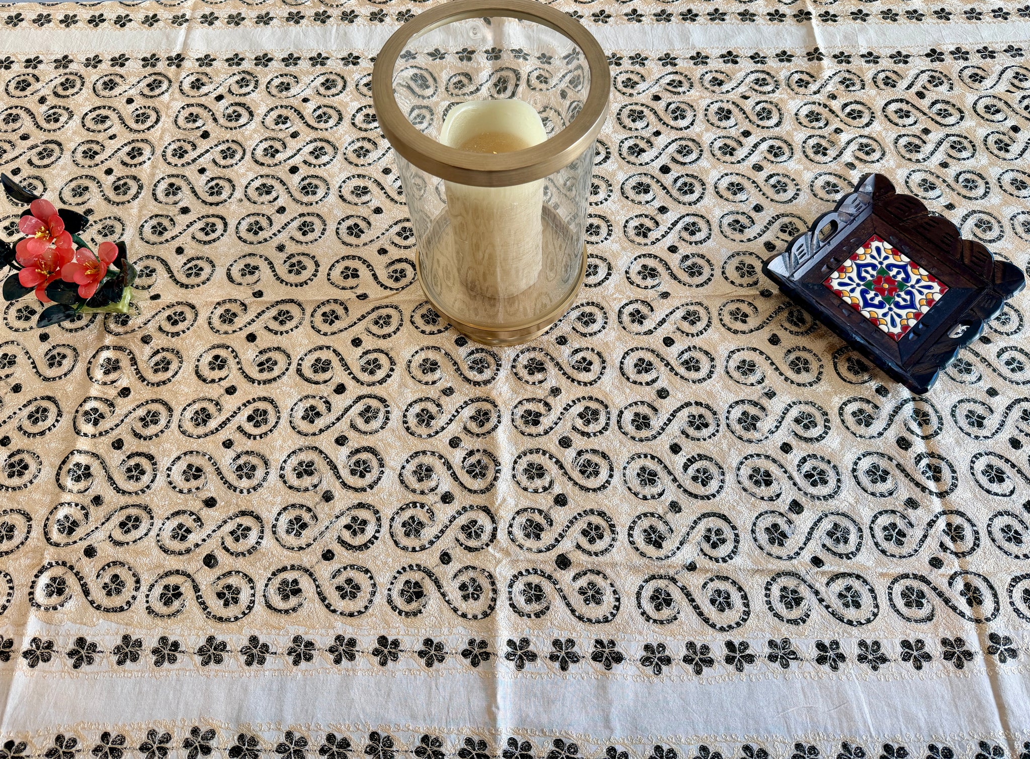 The tablecloth is made of high-quality cotton, hand-embroidered with beige and black silk