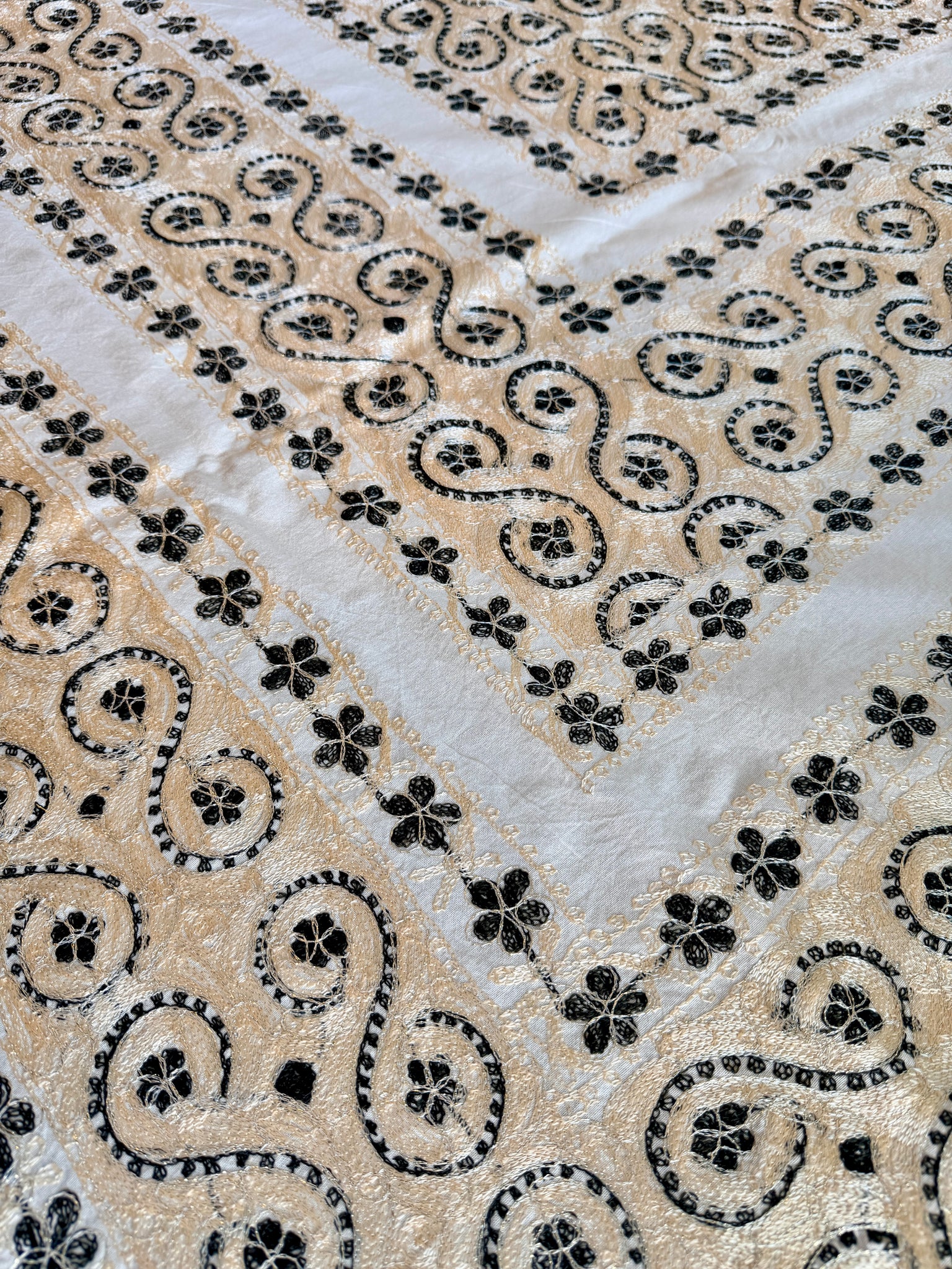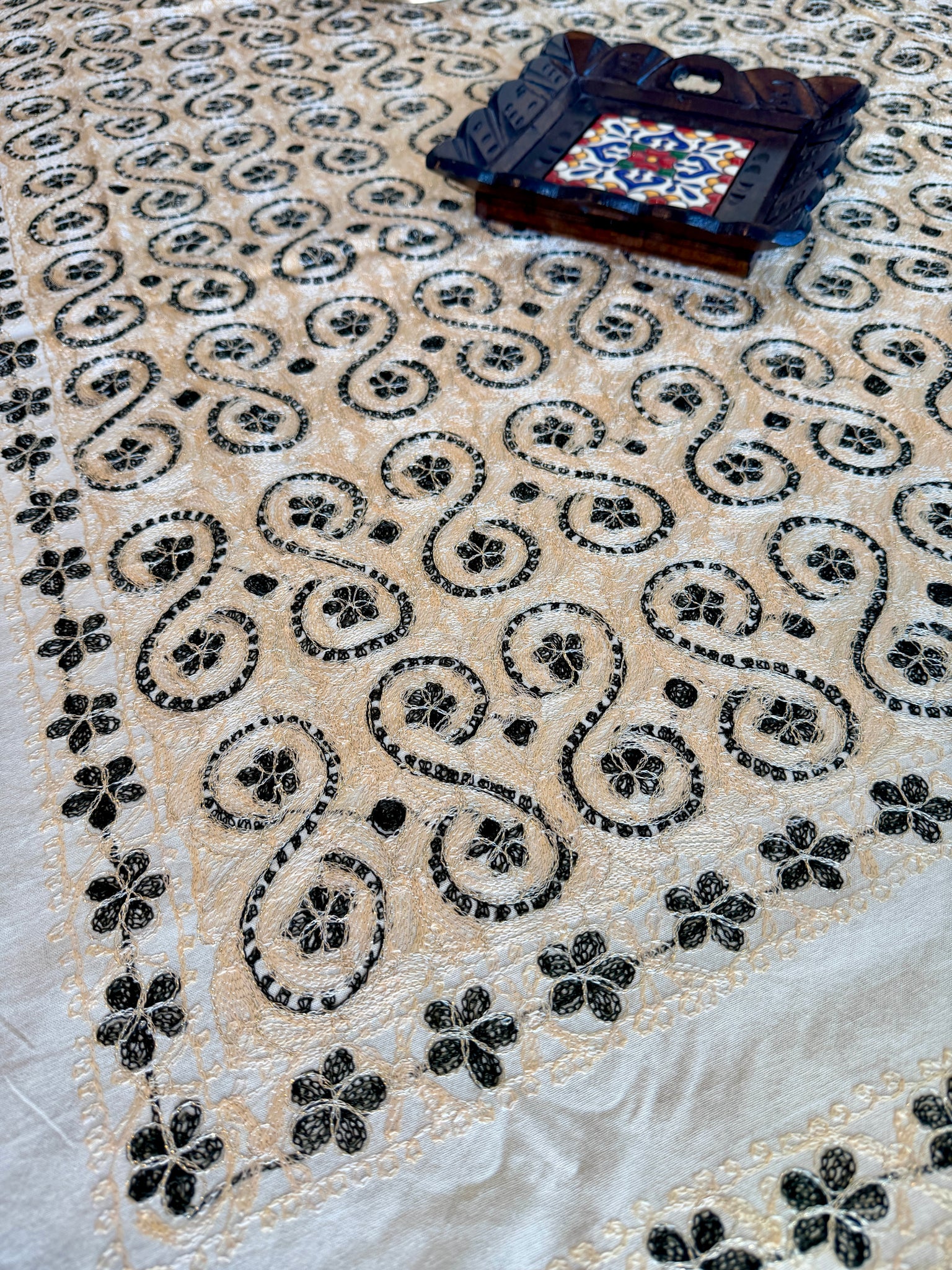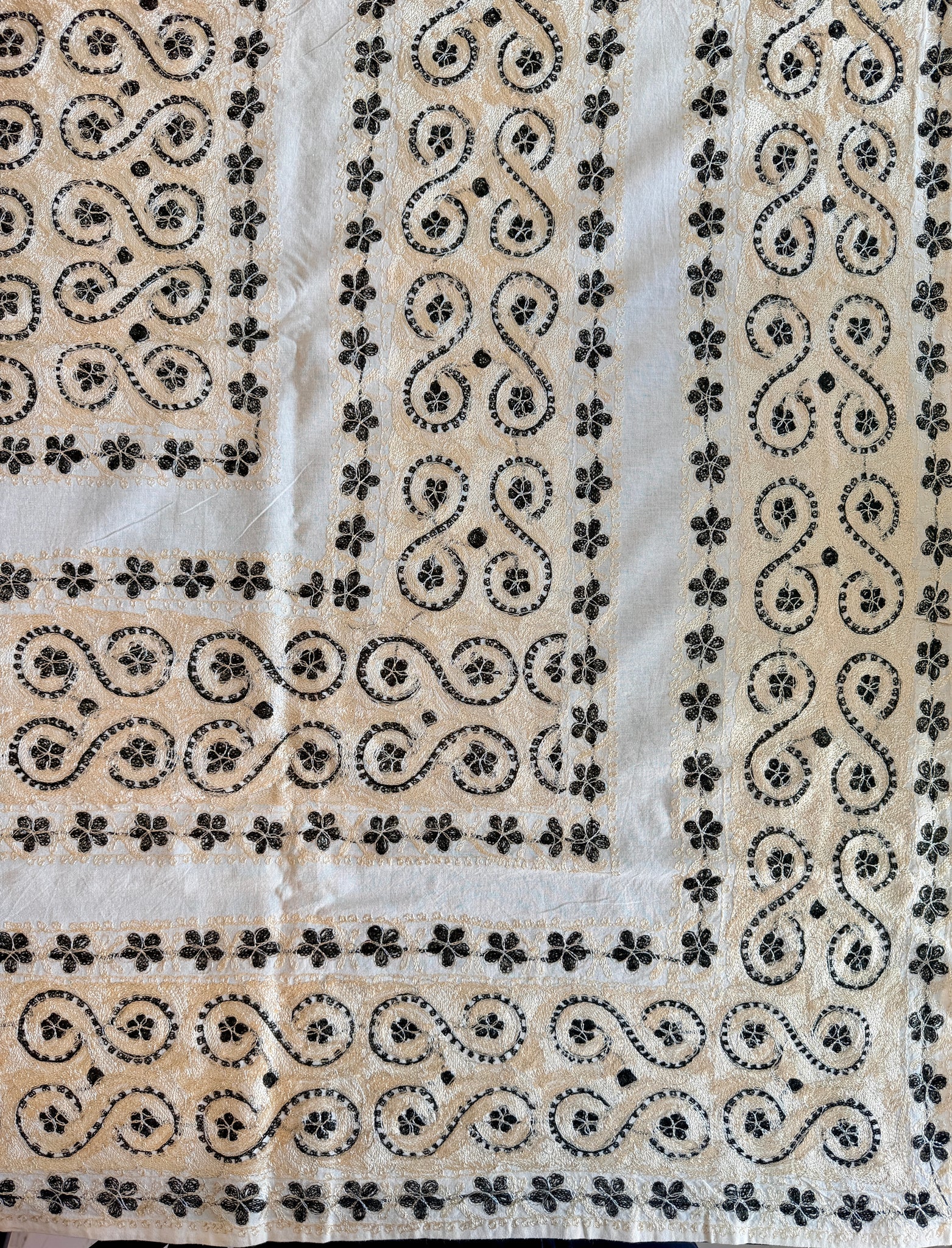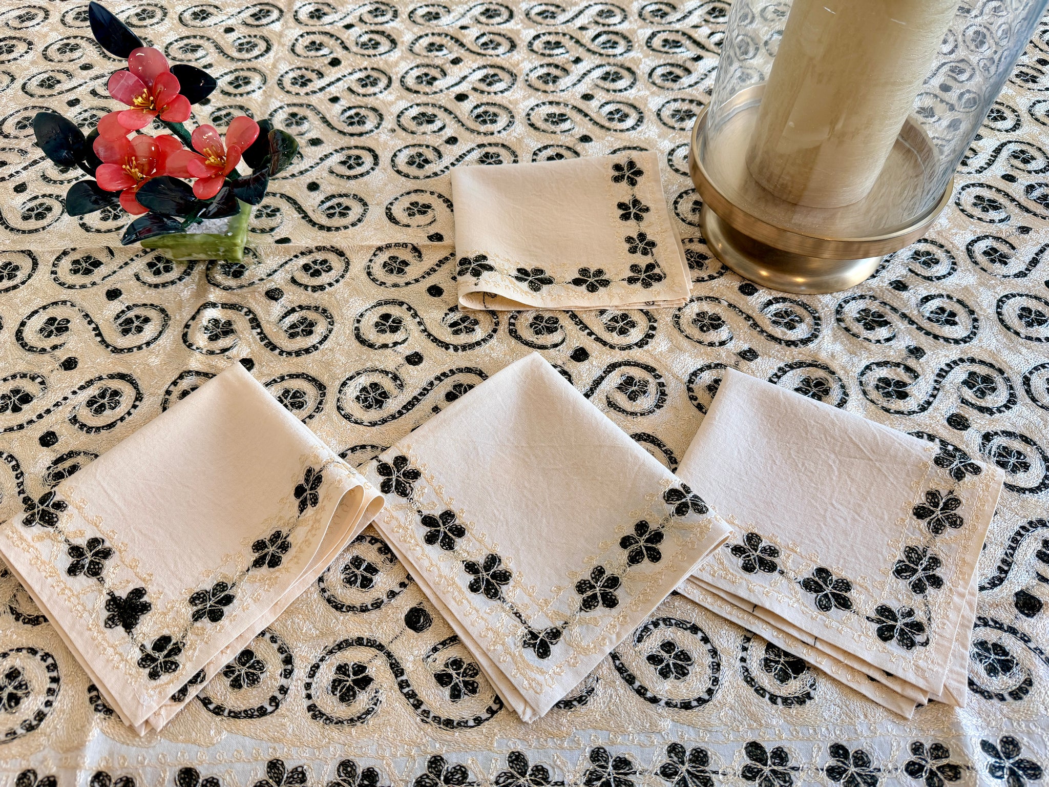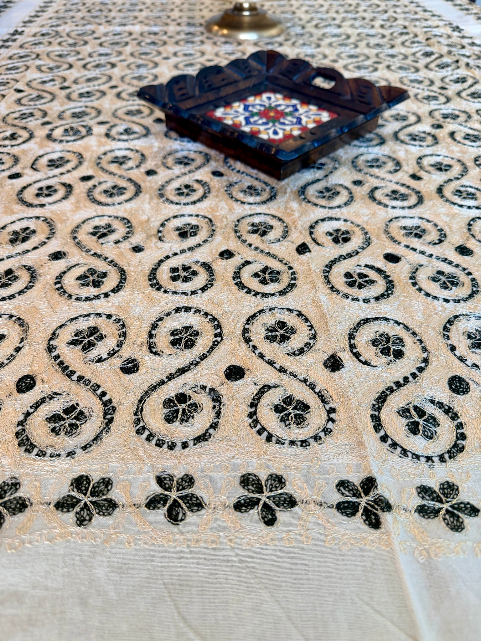 The tablecloth is made of high-quality cotton, hand-embroidered with beige and black silk