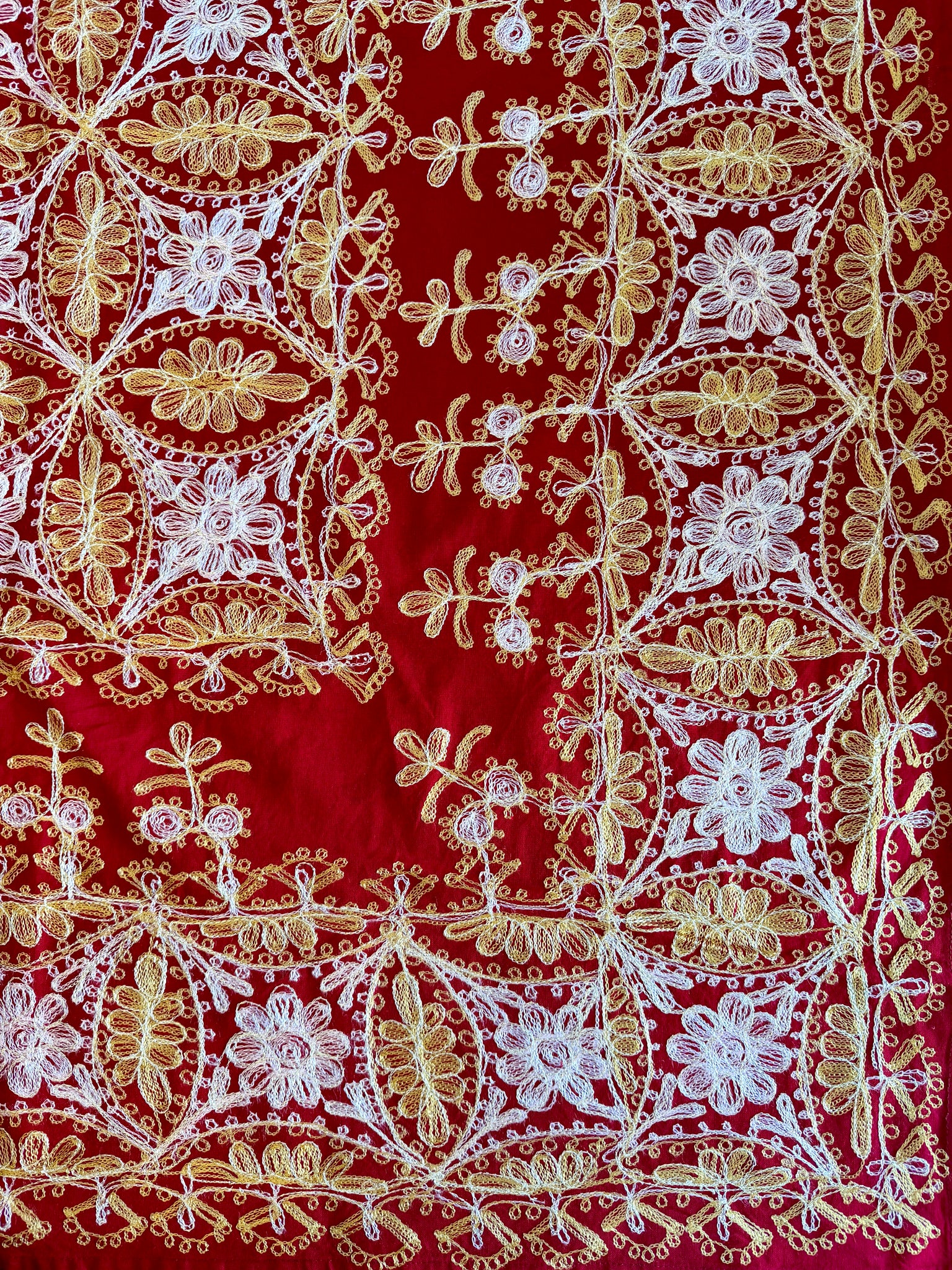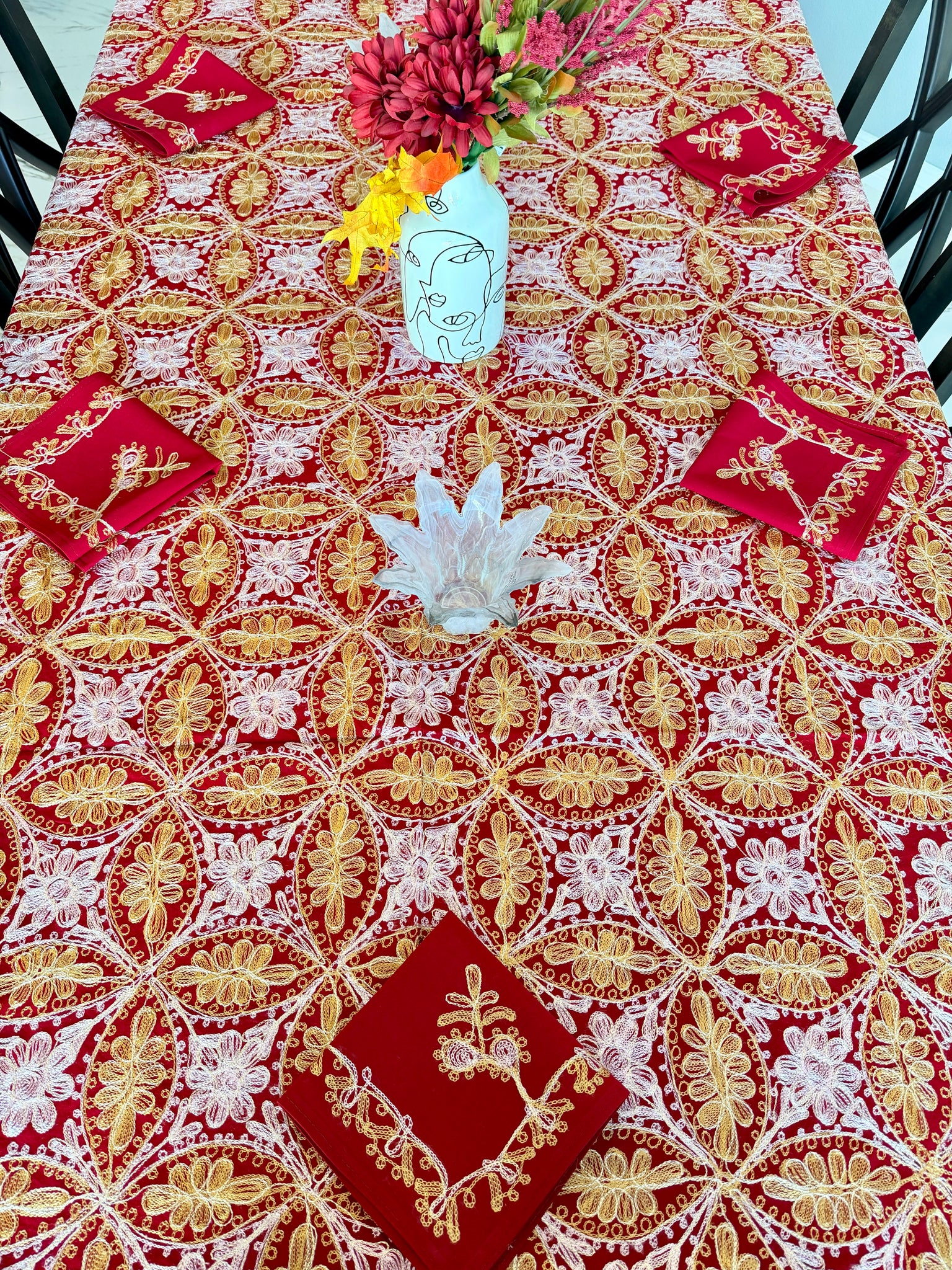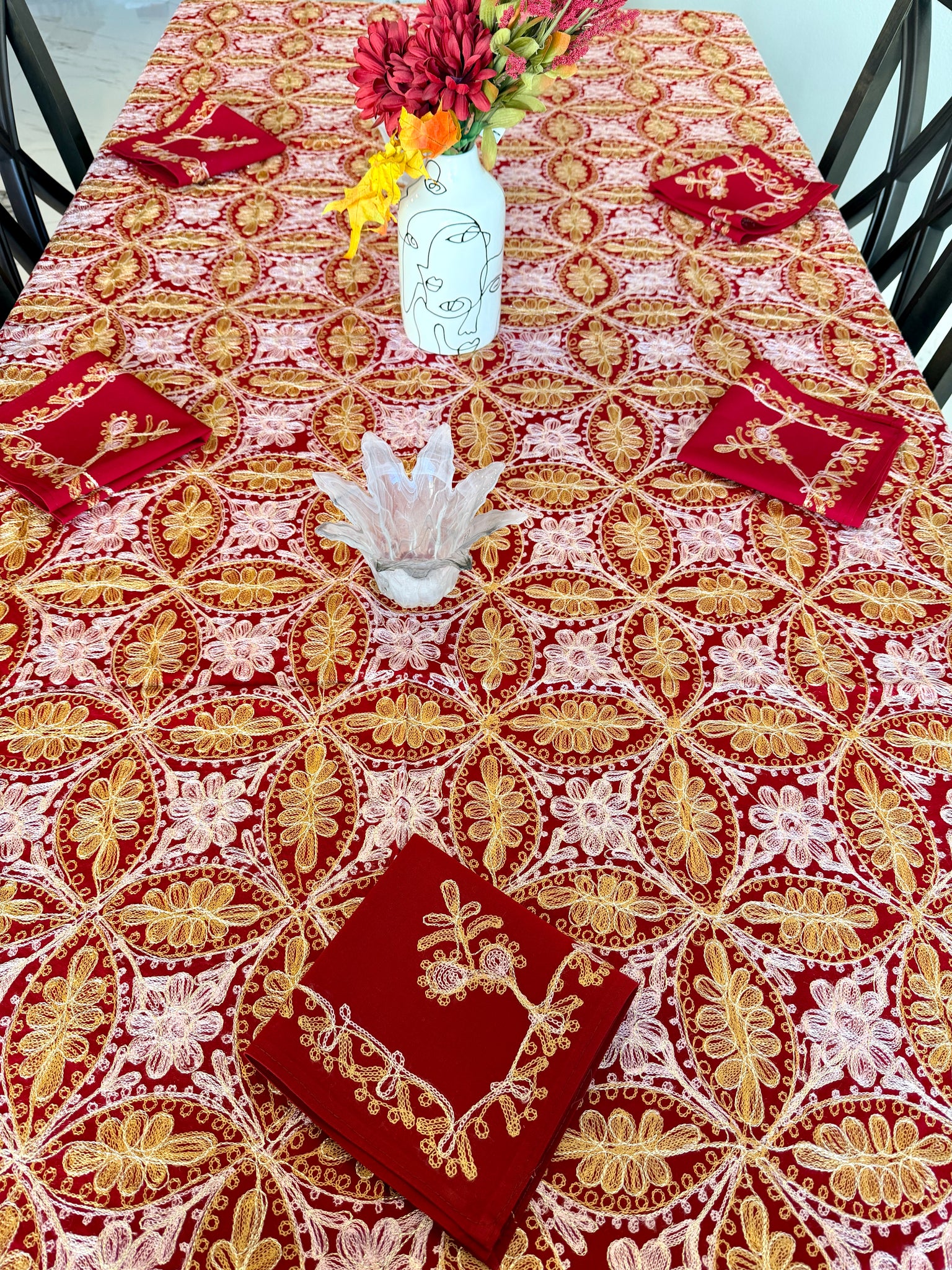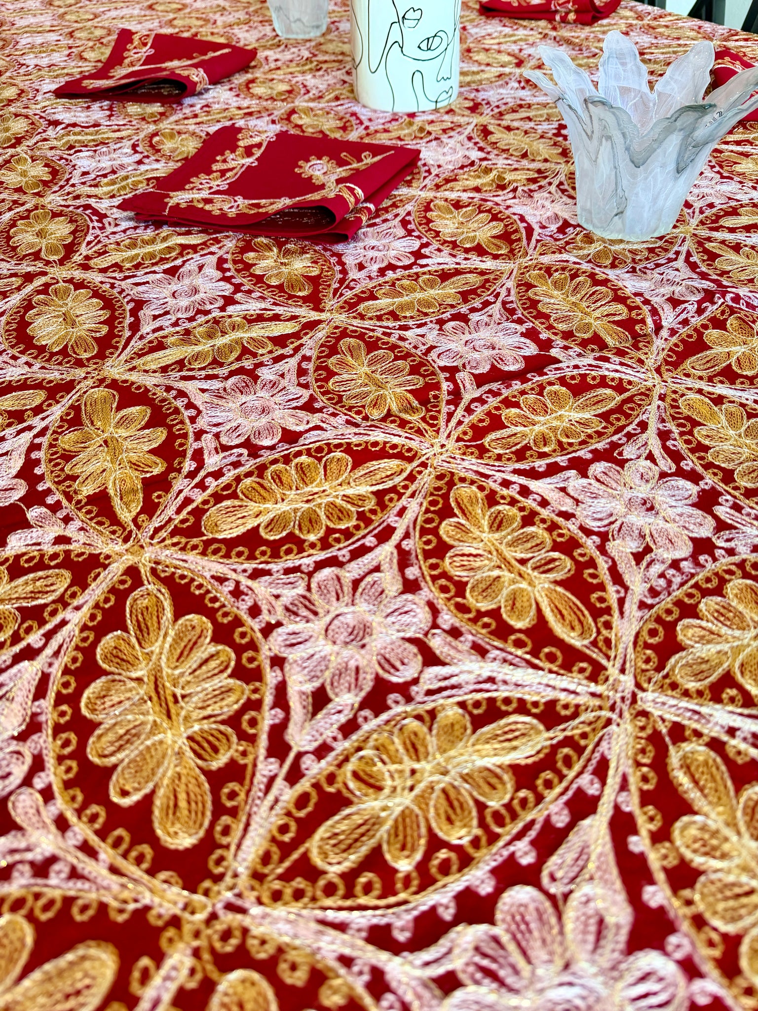 The tablecloth is made of high-quality cotton, hand-embroidered with golden and pink silk
