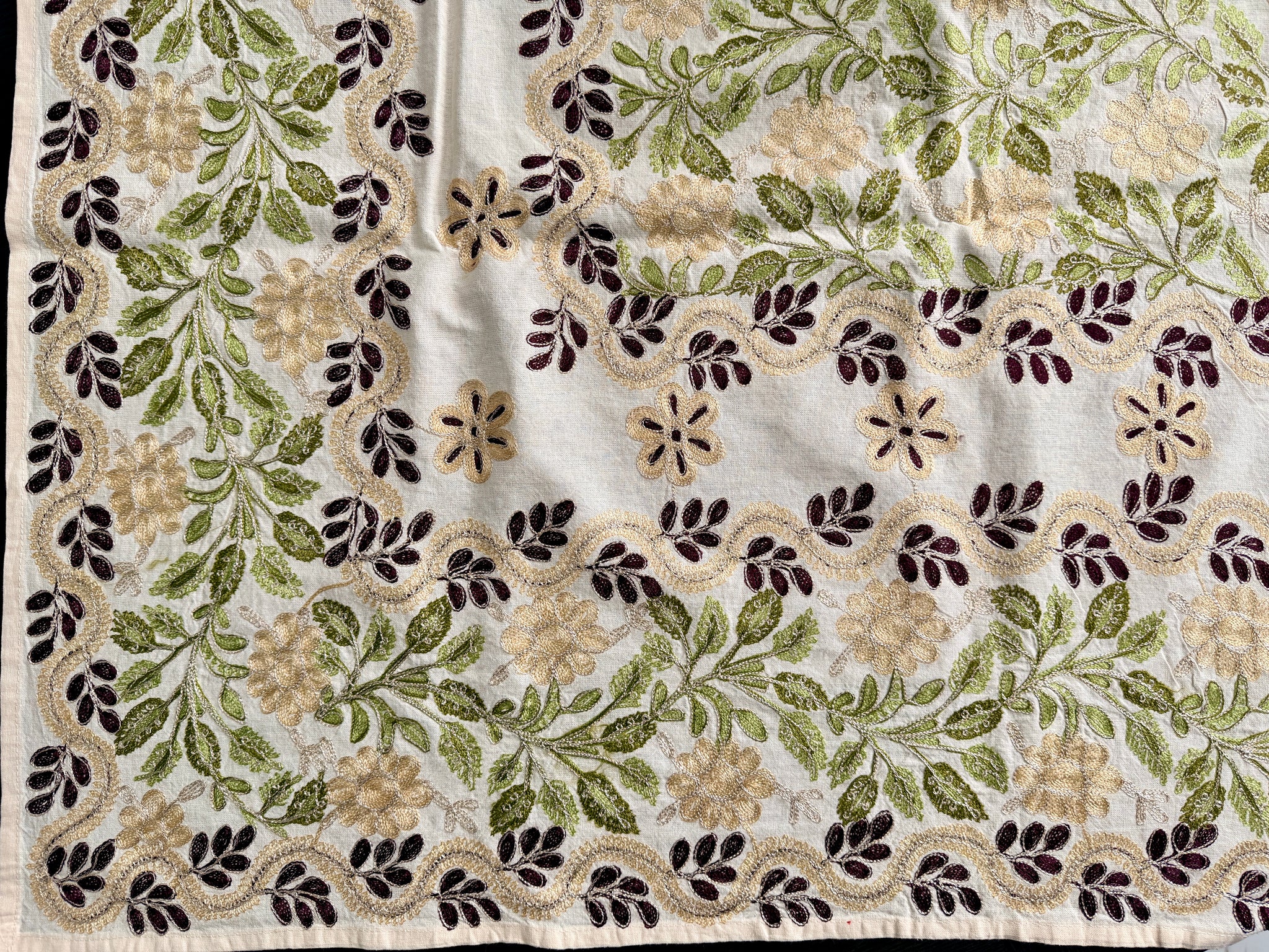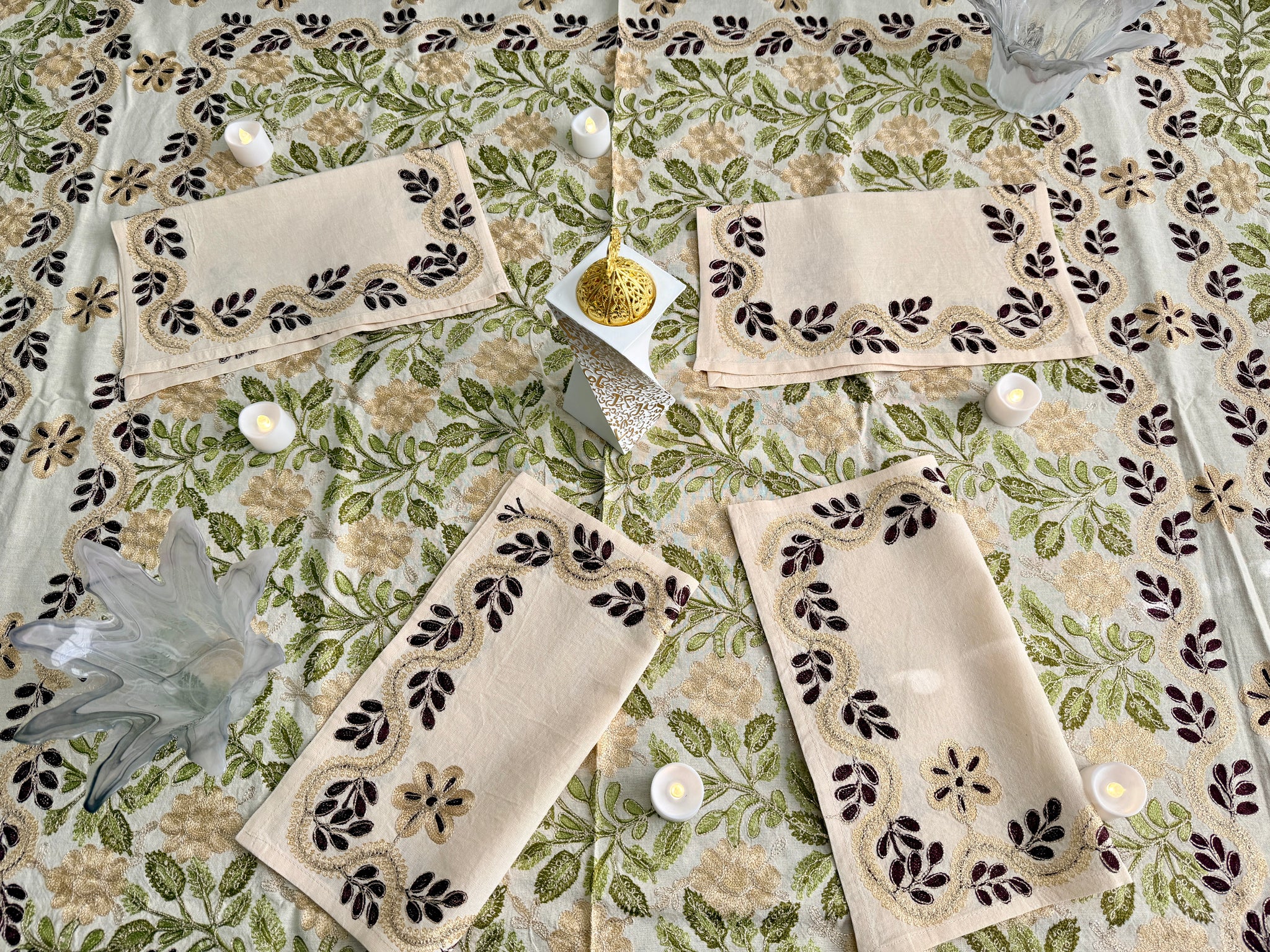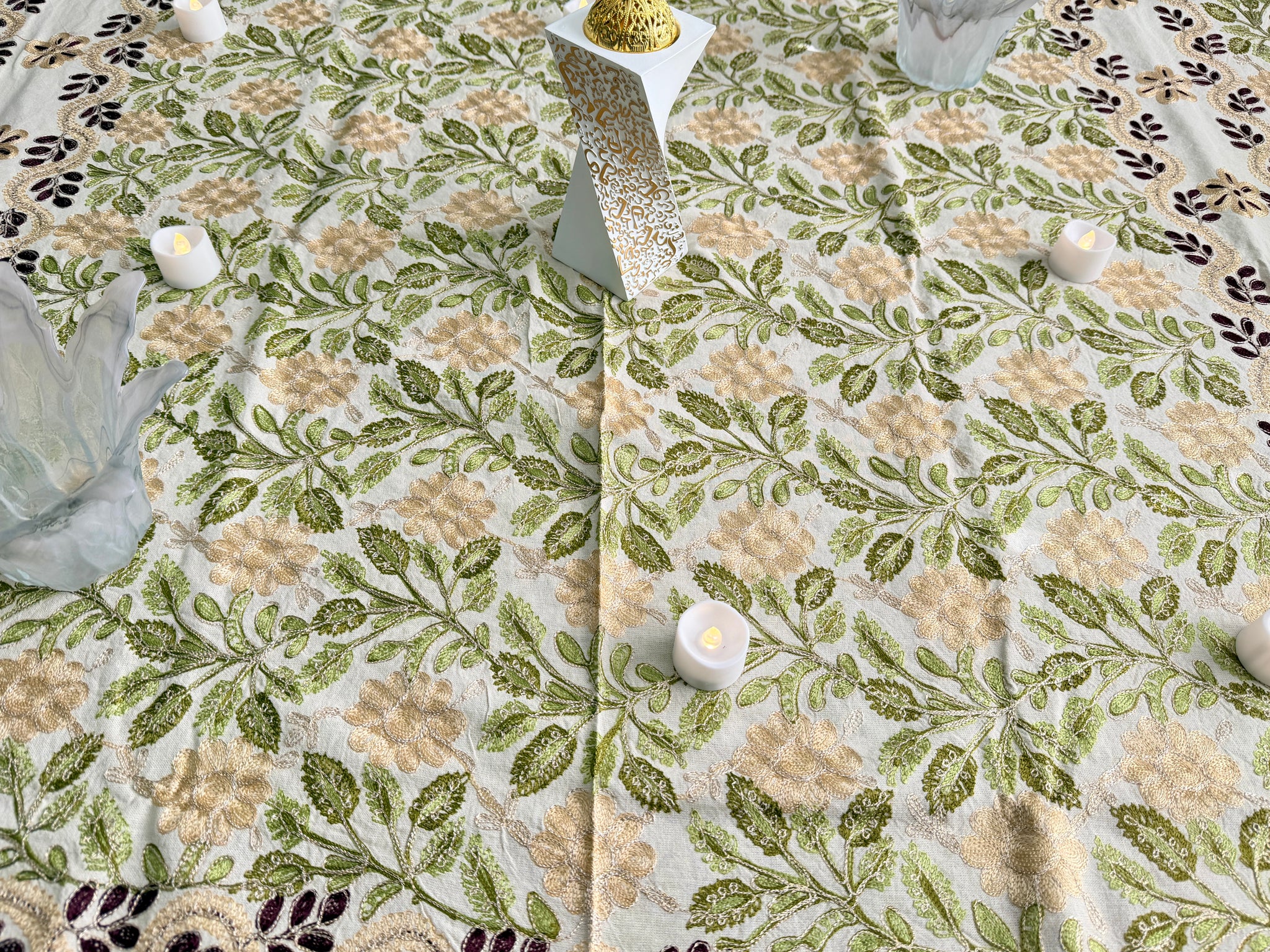 The tablecloth is made of high-quality cotton, hand-embroidered with Brown, Gold and Green silk