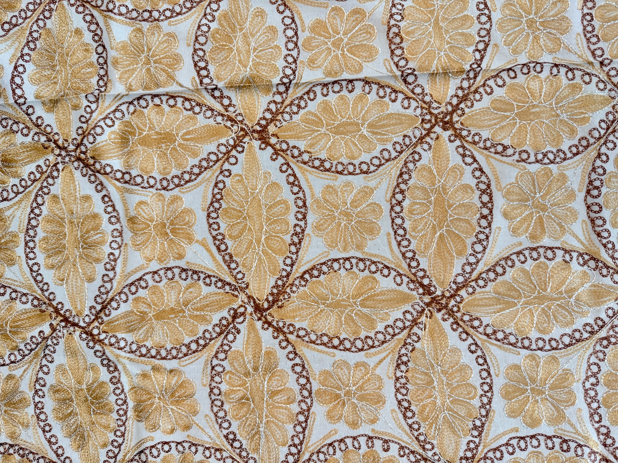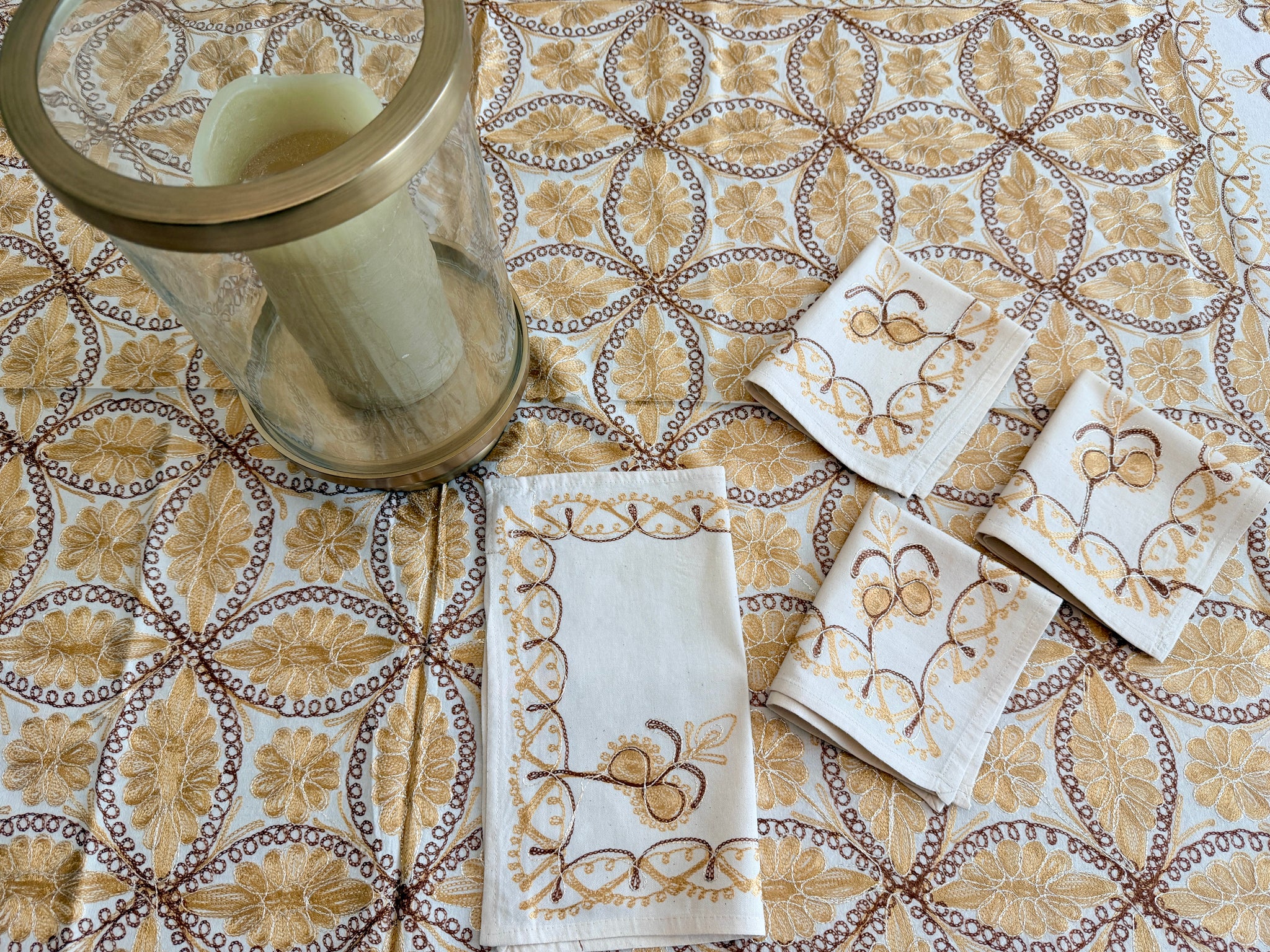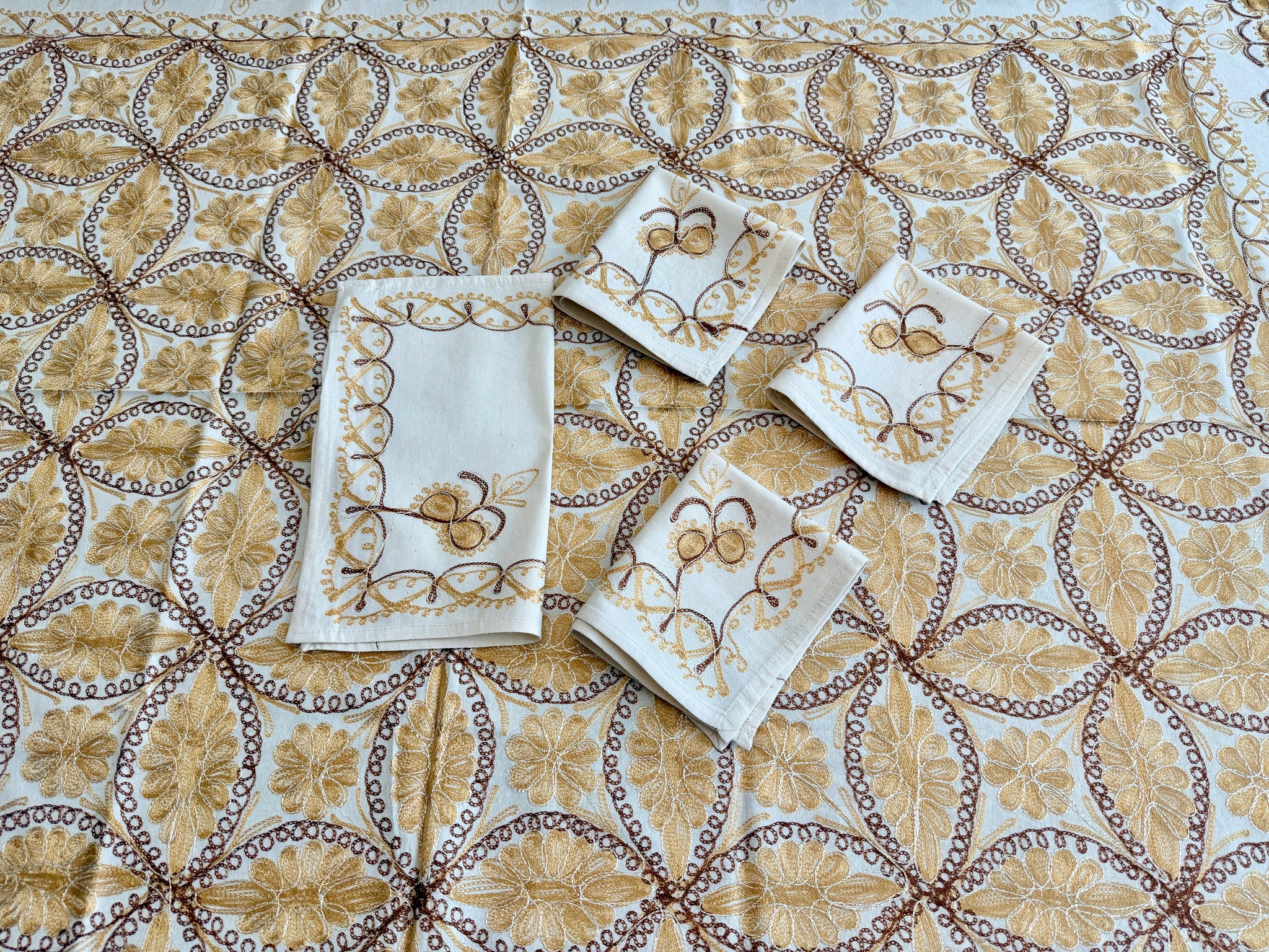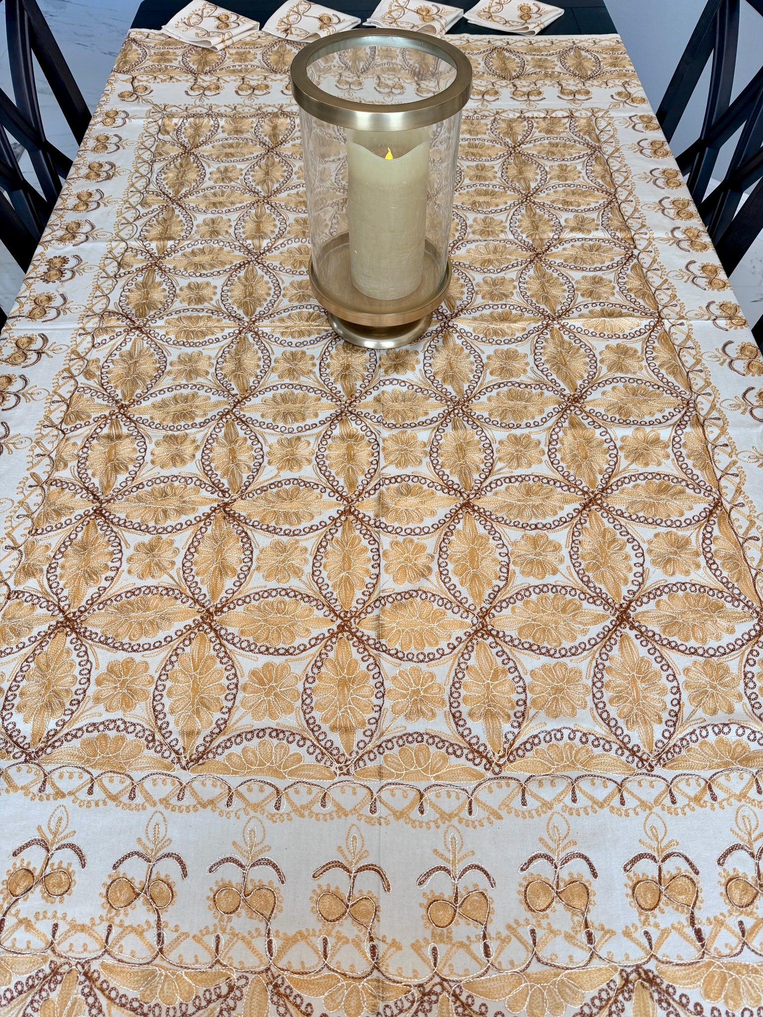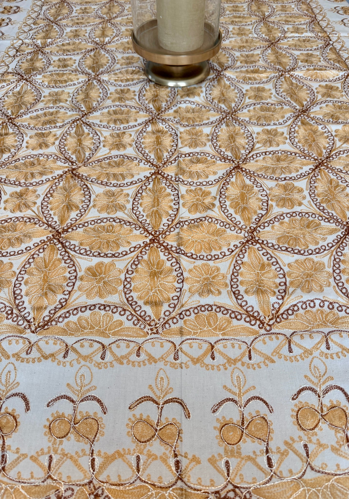The tablecloth is made of high-quality cotton, hand-embroidered with Gold and Brown silk