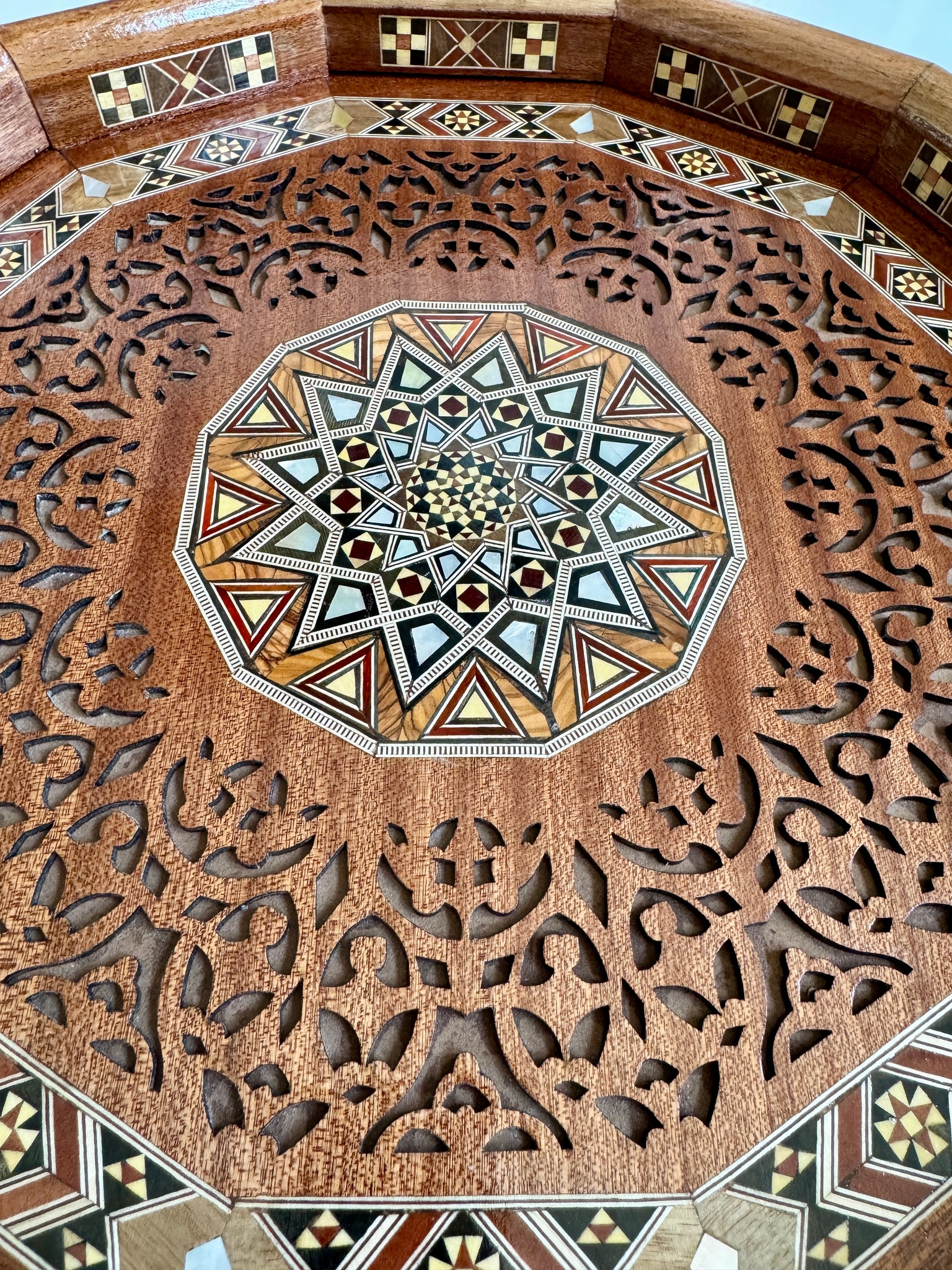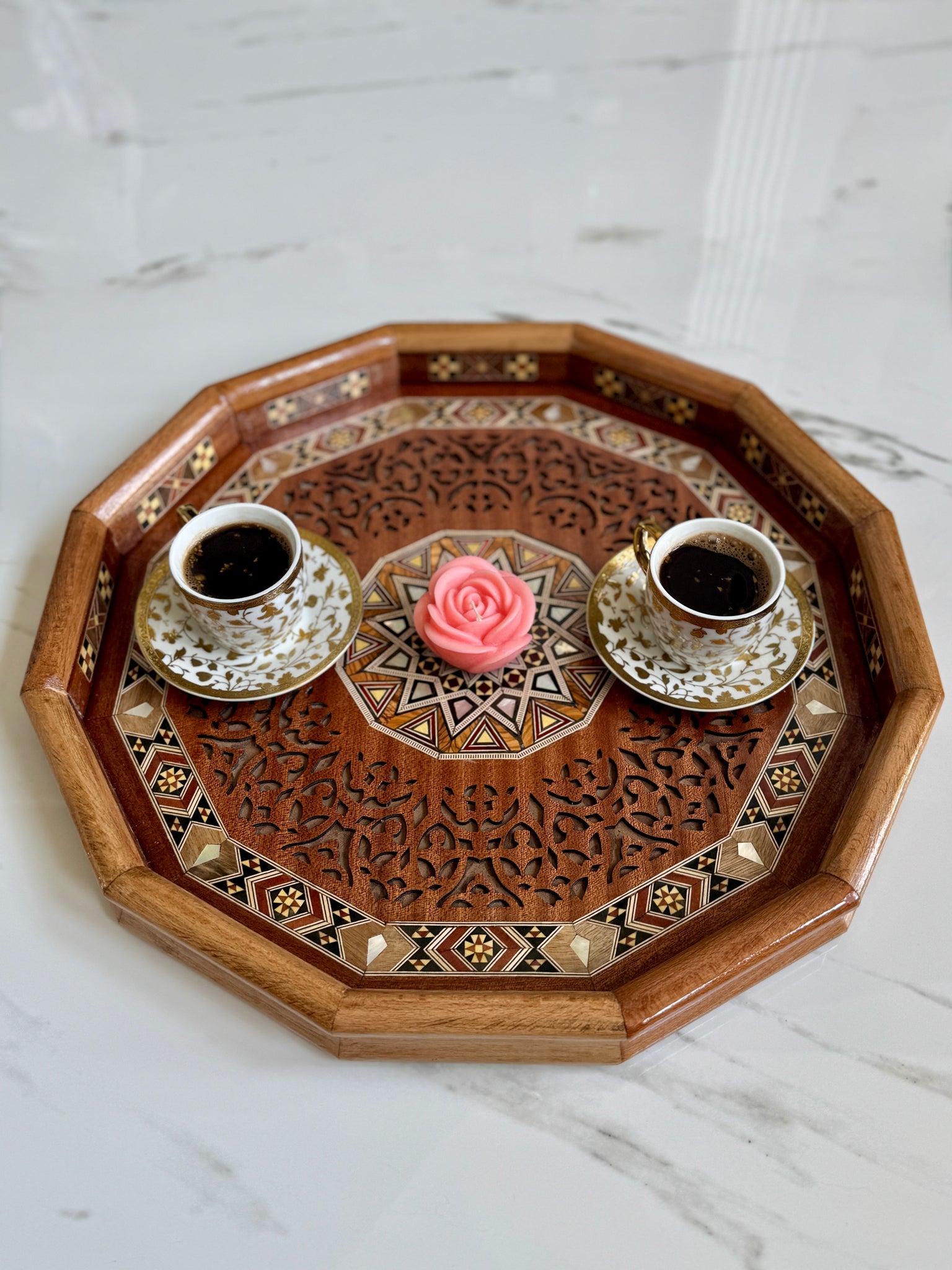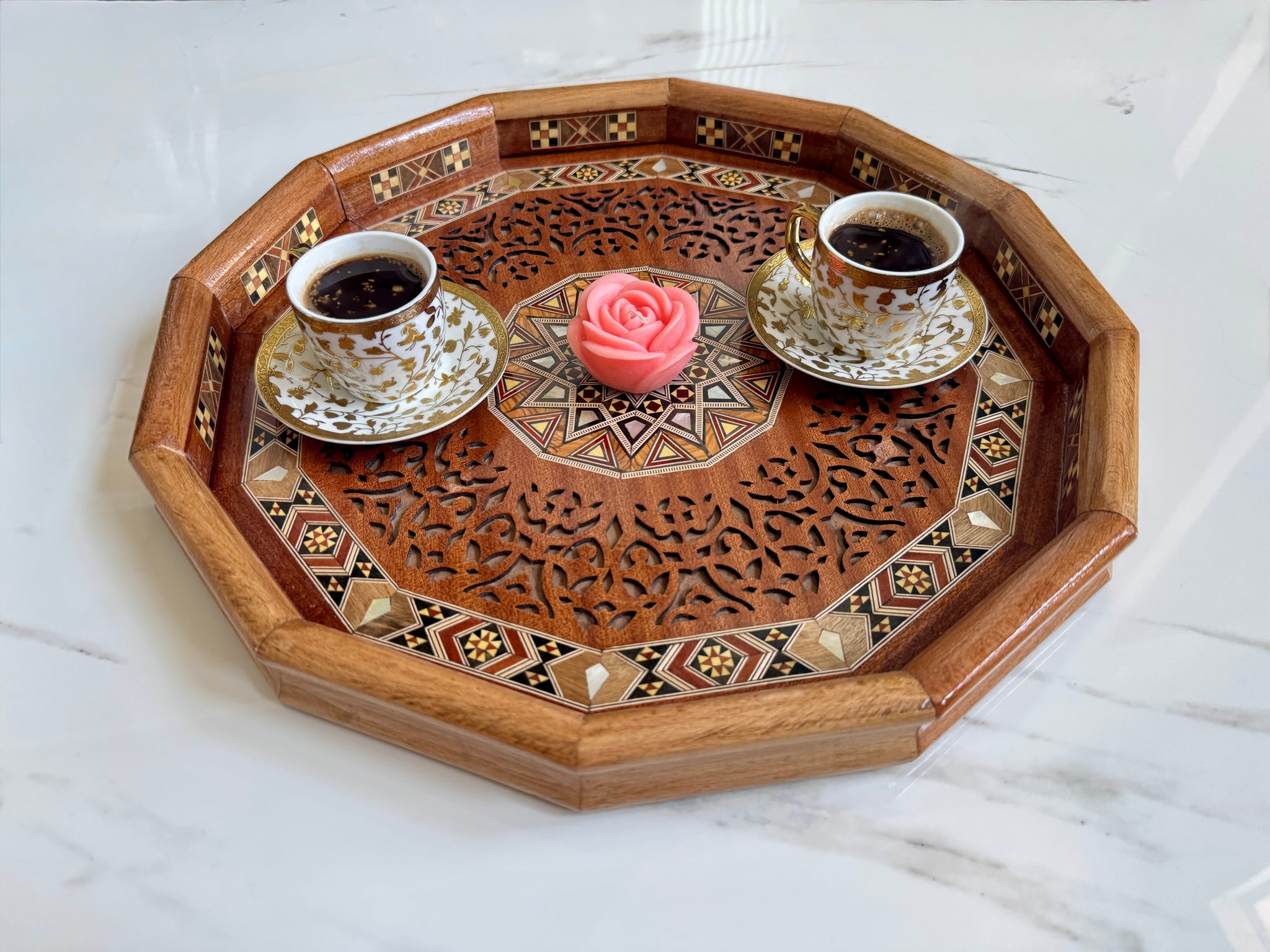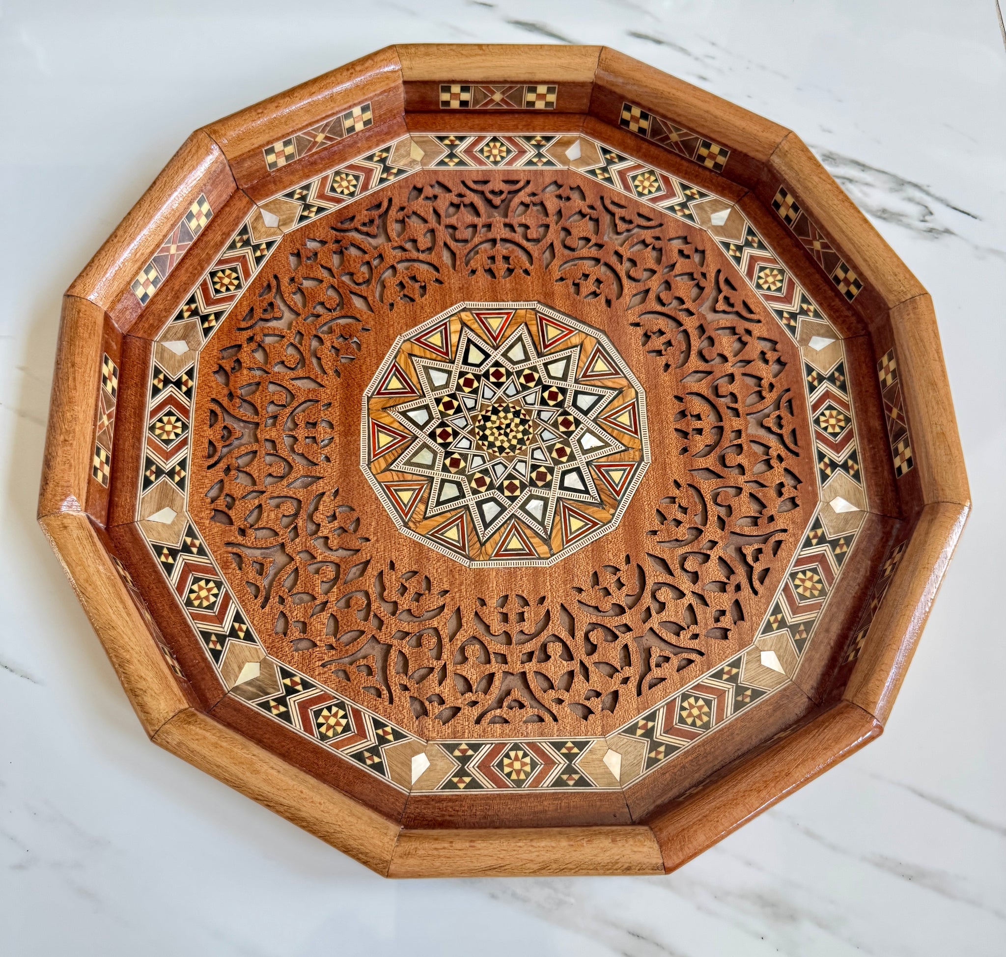 The tray is a beautiful piece of tray and the work involved in making it is clearly shown in the pictures. This item is Handmade.